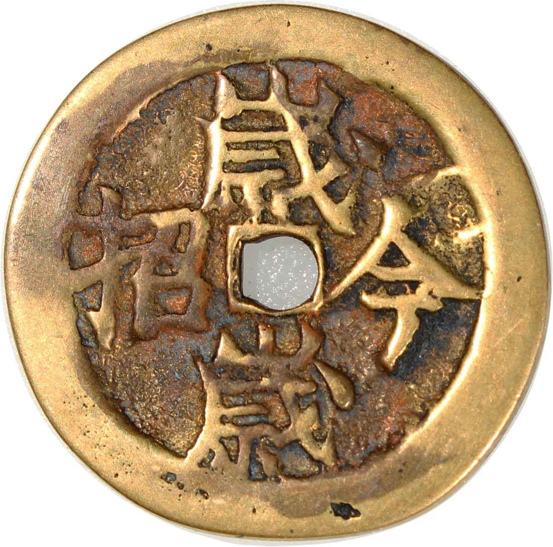 China: Qing Dynasty (1644-1911 CE), coin-shaped charm with square central hole, Guangdong mint production, obverse inscribed 'Nian nian jin ri', reverse inscribed 'Sui sui jin zhao', 26.3*1.9mm, 6.6g. Rare.