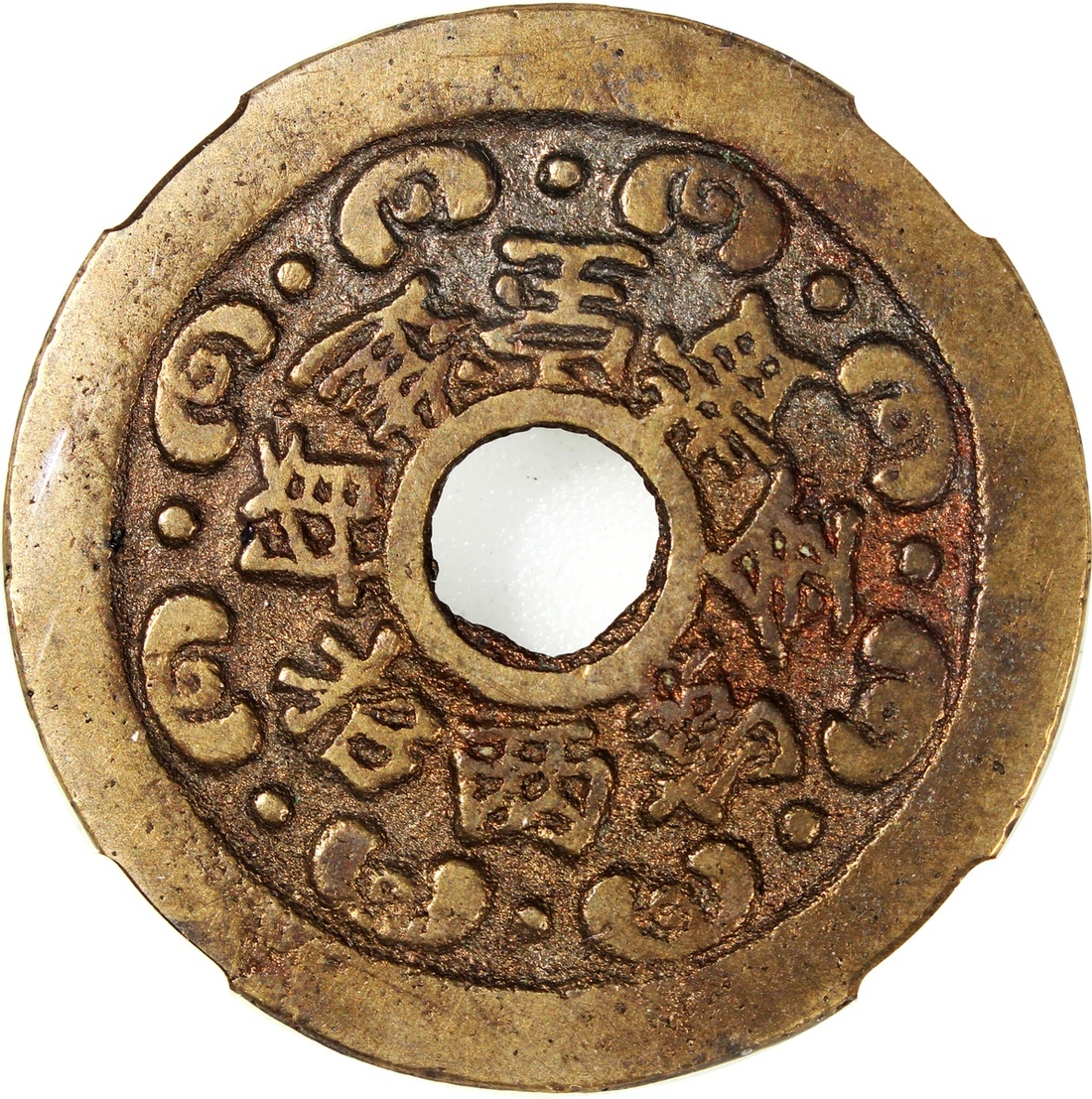China: Qing Dynasty (1644-1911 CE), coin-shaped charm with round hole, Jiangsu mint production, obverse inscribed 'Zhao cai jin bao huang jin wan liang' decorated with ingots, reverse showing human figure with lion, 44.1*1.9mm, 19.4g, Zhong Qian 82.
