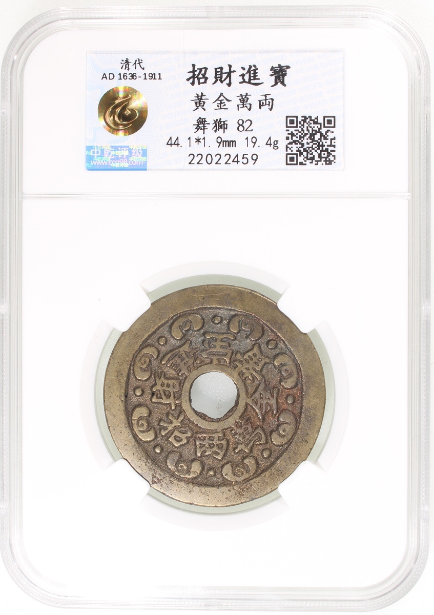蘇爐招財進寶黃金萬兩圓穿花錢,背胡人戲獅,清朝(公元1644–1911),44.1*1.9mm,重19.4g,中乾82。