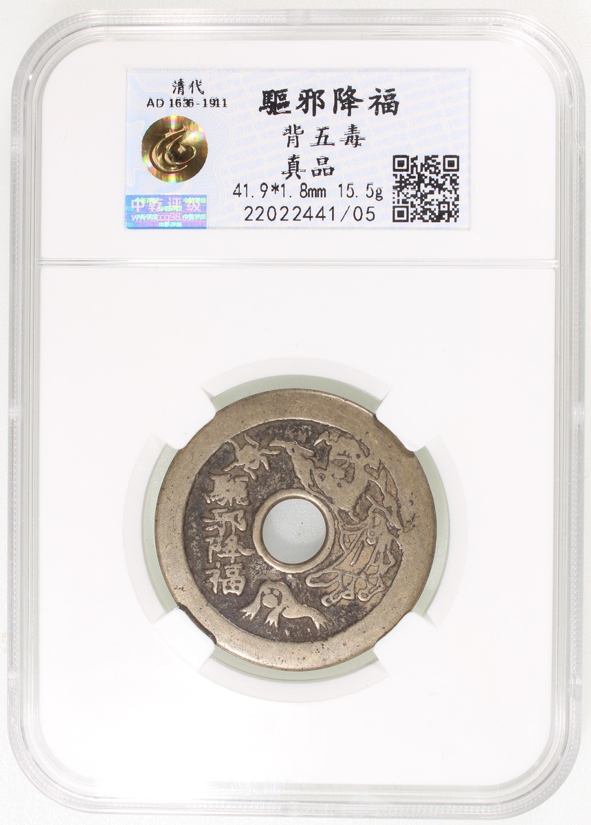 China: Qing Dynasty (1644-1911 CE), coin-shaped charm with round hole, obverse inscribed 'Qu xie jiang fu' decorated with Zhong Kui and toad, reverse showing five poisonous animals, 41.9*1.8mm, 15.5g, Zhong Qian Genuine.