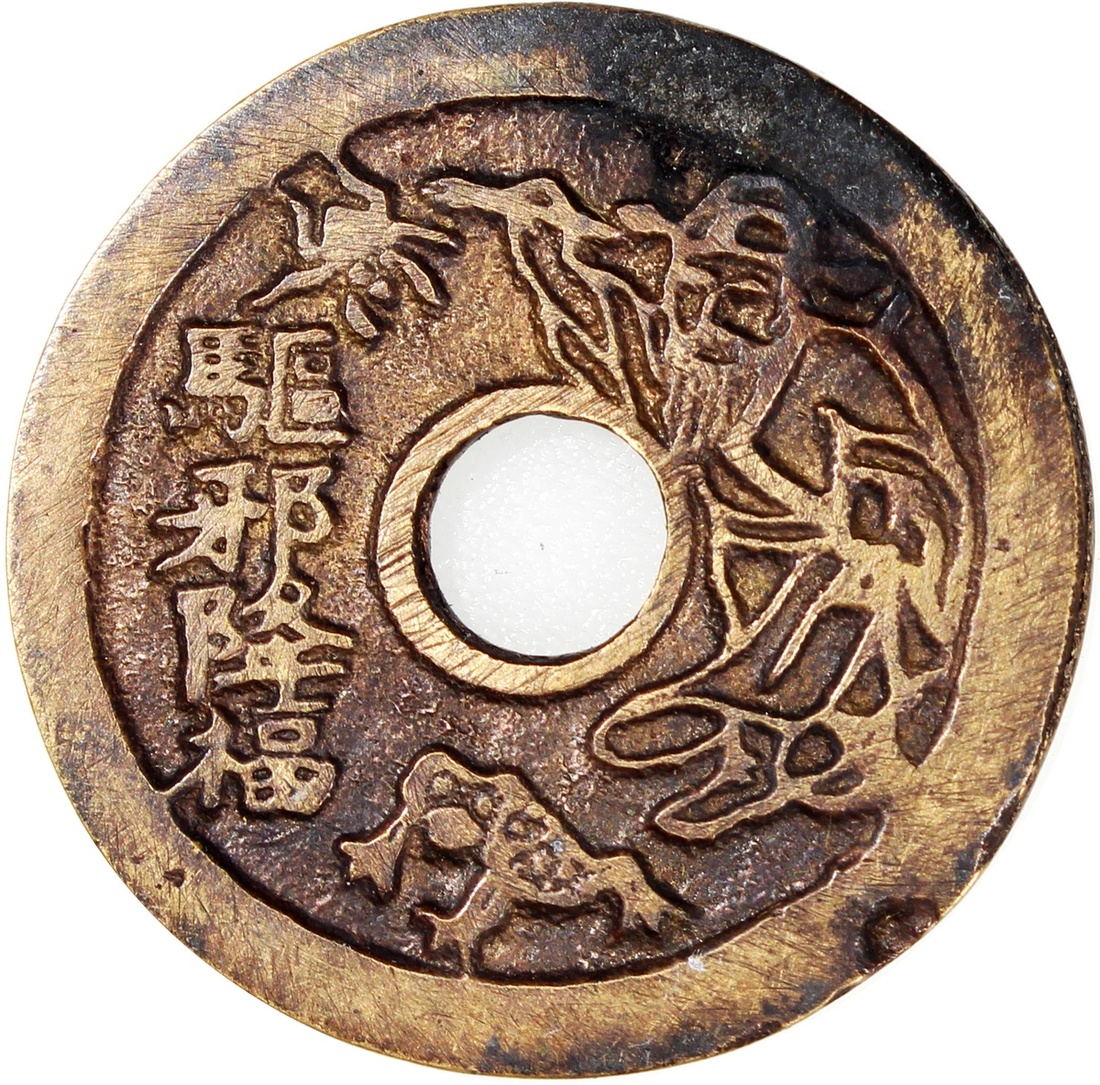 China: Qing Dynasty (1644-1911 CE), coin-shaped charm with round hole, obverse inscribed 'Qu xie jiang fu' decorated with Zhong Kui and toad, reverse showing five poisonous animals, 28.9*2.0mm, 8.9g. 1 Cash in size, rare.