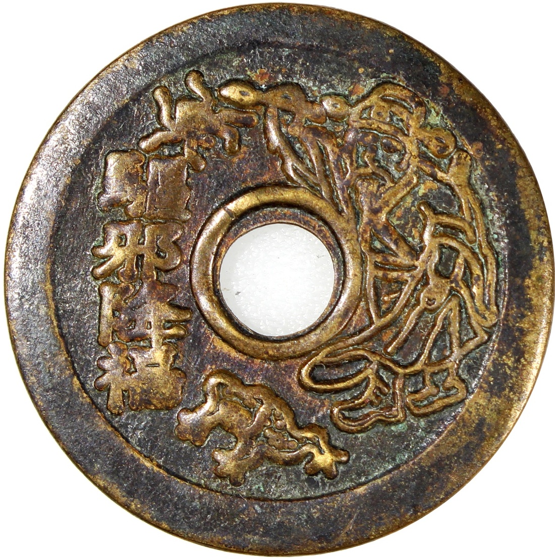 China: Qing Dynasty (1644-1911 CE), coin-shaped charm with round hole, obverse inscribed 'Qu xie jiang fu' decorated with Zhong Kui and toad, reverse showing five poisonous animals, 29.4*1.7mm, 6.4g. 1 Cash in size, rare.