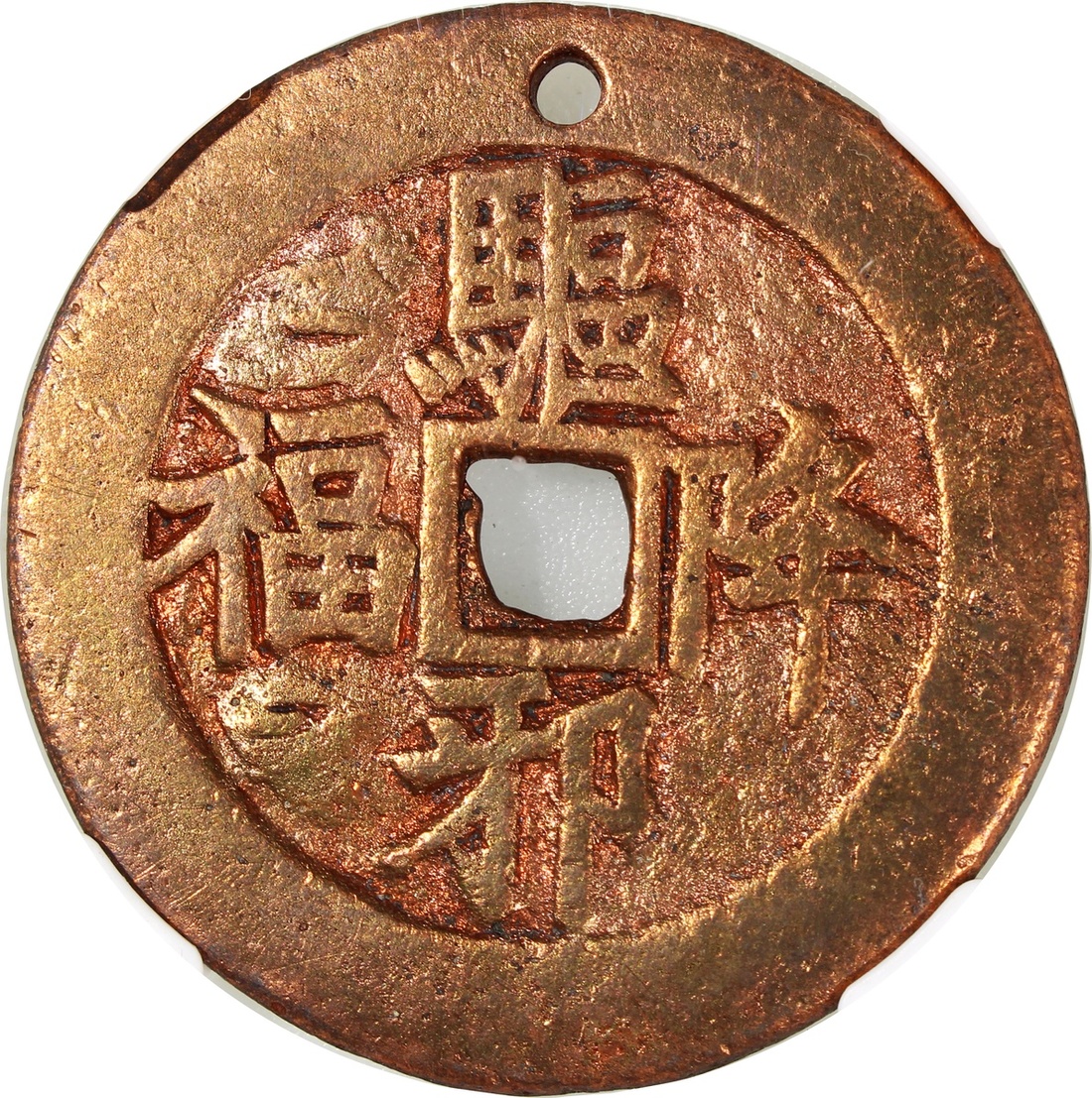 China: Qing Dynasty (1644-1911 CE), coin-shaped charm with square central hole, obverse inscribed 'Qu xie jiang fu', reverse showing Zhong Kui driving away demons, 51.1*3.0mm, 37.9g, Zhong Qian Genuine.