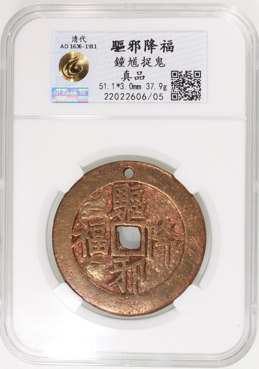 驅邪降福方孔花錢,背鍾馗驅鬼,清朝(公元1644–1911),51.1*3.0mm,重37.9g,中乾真品。