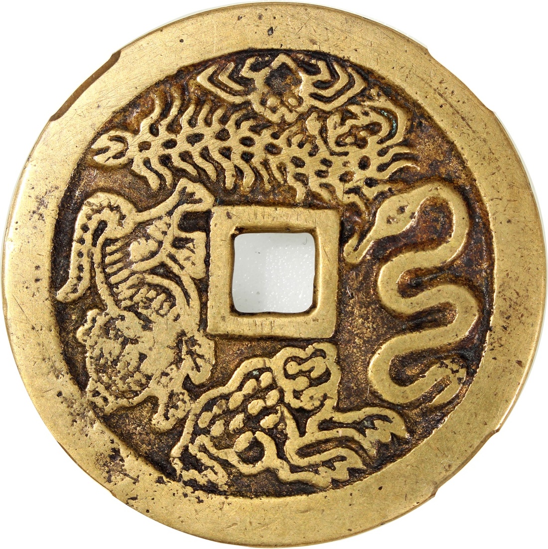 China: Qing Dynasty (1644-1911 CE), coin-shaped charm with square central hole, obverse showing the five poisonous animals, reverse showing an assortment of medical herbs, 51.1*2.2mm, 31.7g. Zhong Qian 82. Extremely fine, rare.