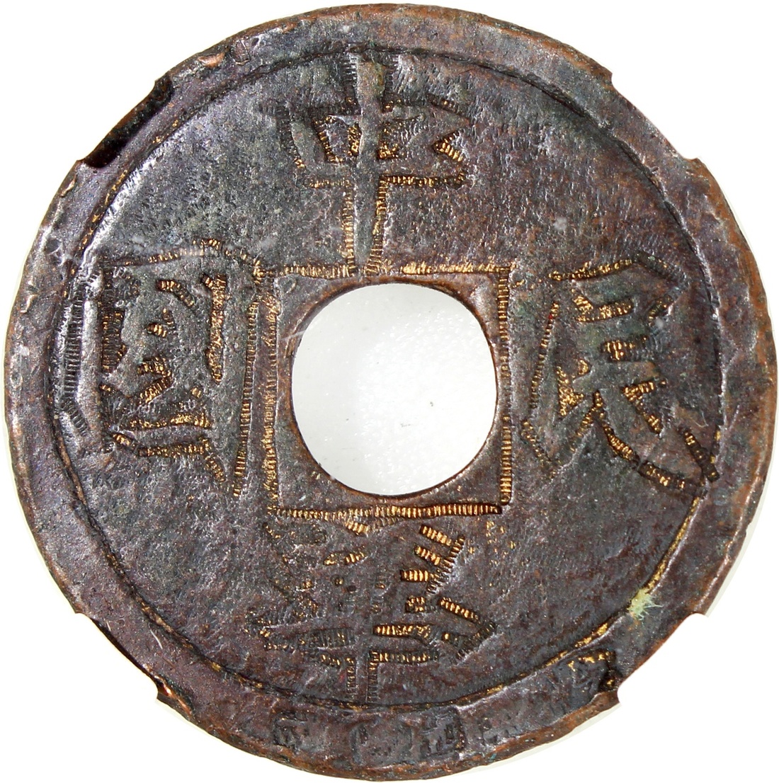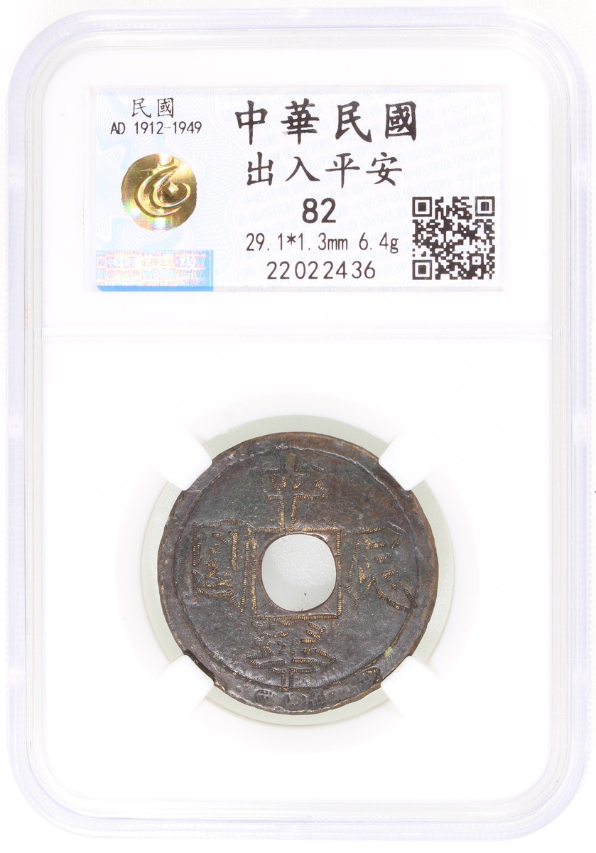 China: Republican Period (1911-1949 CE), coin-shaped charm with round hole, obverse inscribed 'Zhong hua min guo', reverse inscribed 'Chu ru ping an', 29.1*1.3mm, 6.4g, Zhong Qian 82. Traces of gilding, rare.