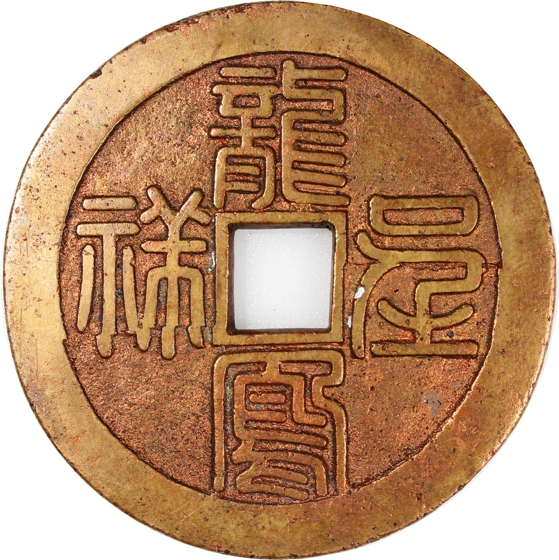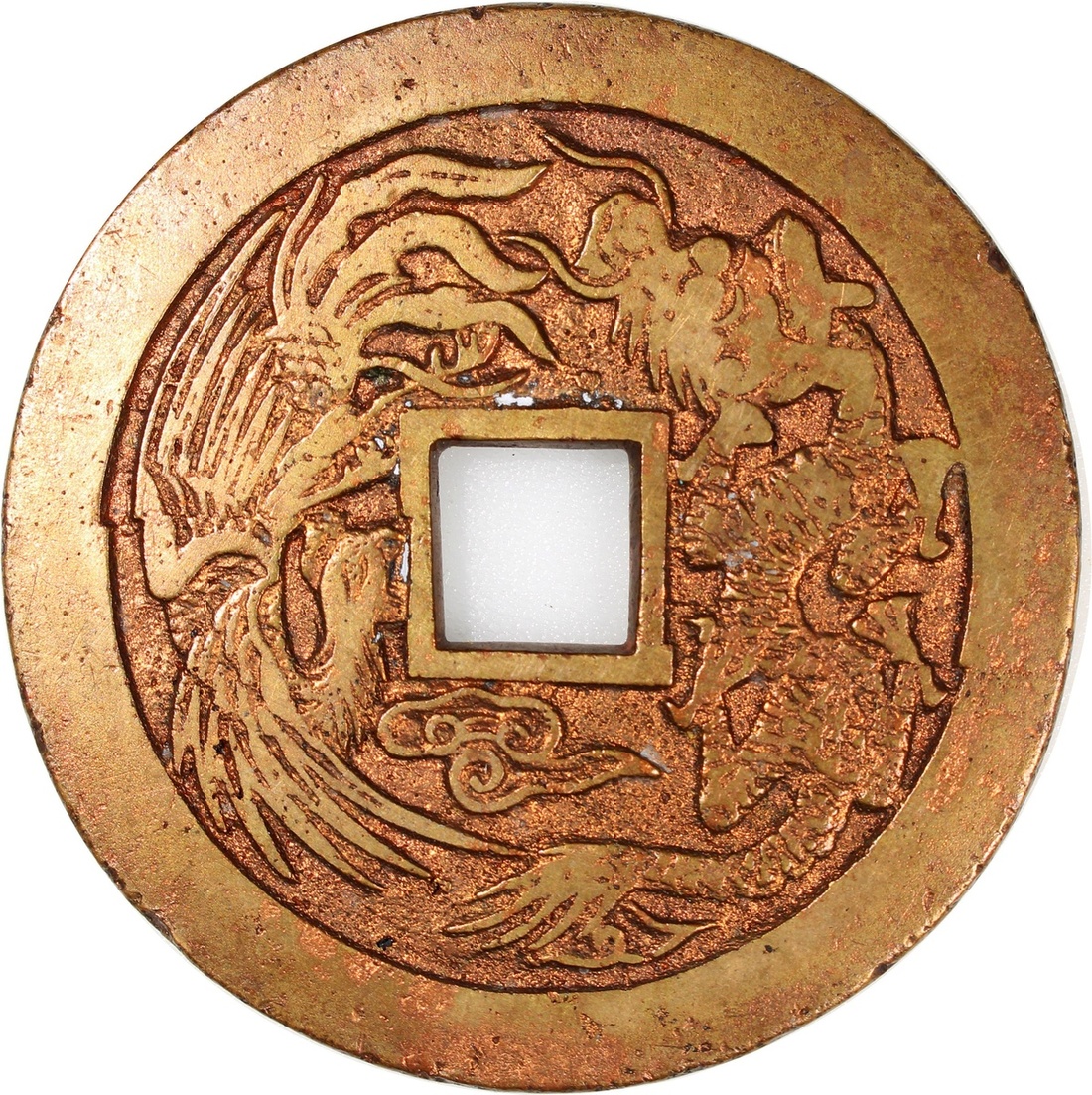 China: Republican Period (1911-1949 CE), coin-shaped charm with square hole, obverse inscribed 'Long feng cheng xiang' in seal script, reverse showing dragon and phoenix, 58.2*3.4mm, 64.4g. Extremely fine, rare.