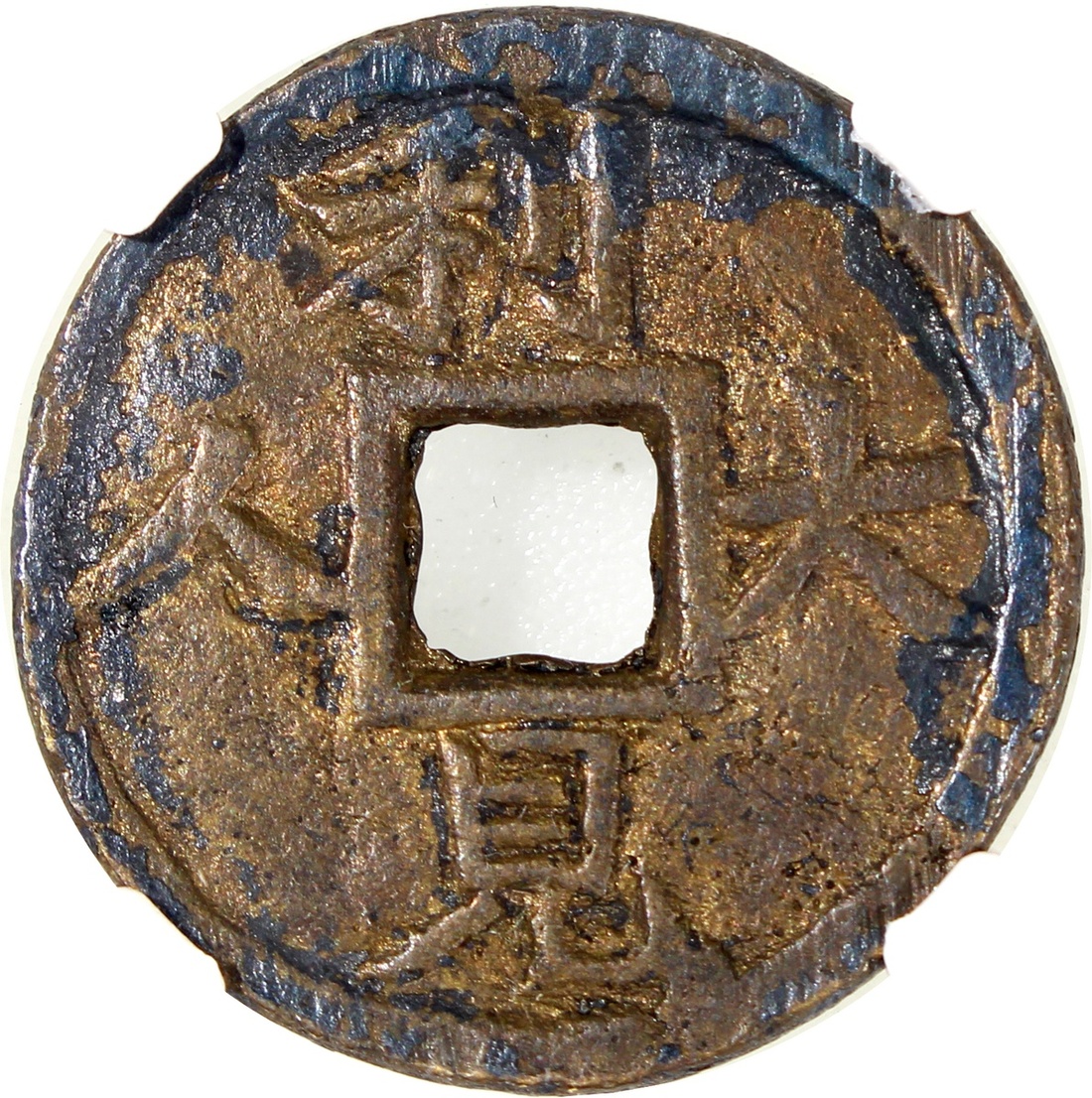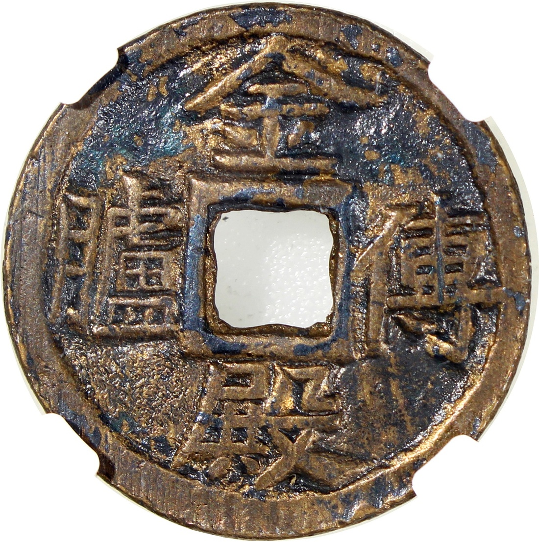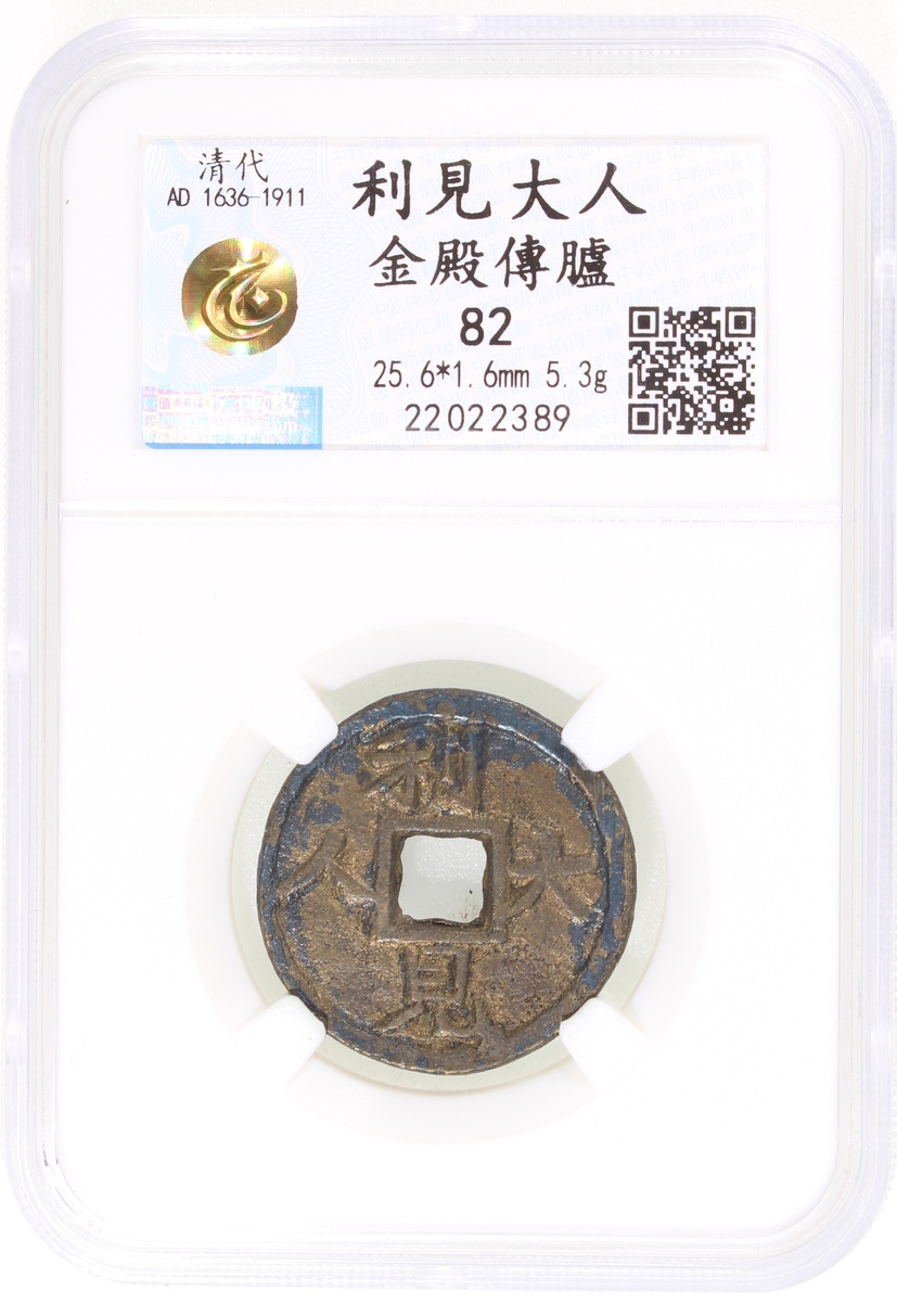 利見大人方穿花錢,背“金殿傅臚”,清朝(公元1644–1911),25.6*1.6mm,重5.3g,中乾82。少見品。
