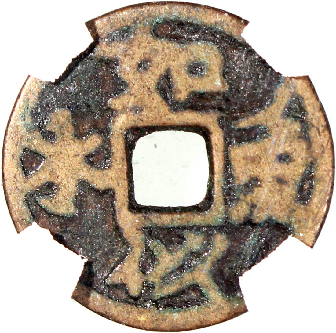 China: Liao-Jin Dynasty (916-1234 CE), coin-shaped charm with square hole, obverse inscribed 'Ru yu si shui', plain reverse, 15.3*0.9mm, 1.1g, Zhong Qian 80, labelled as Qing Dynasty. Plain reverse, rare.