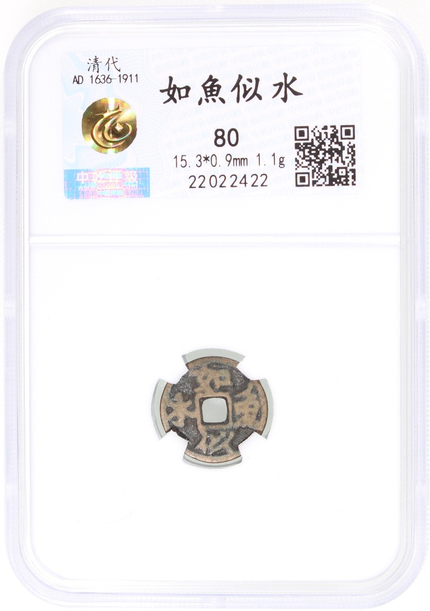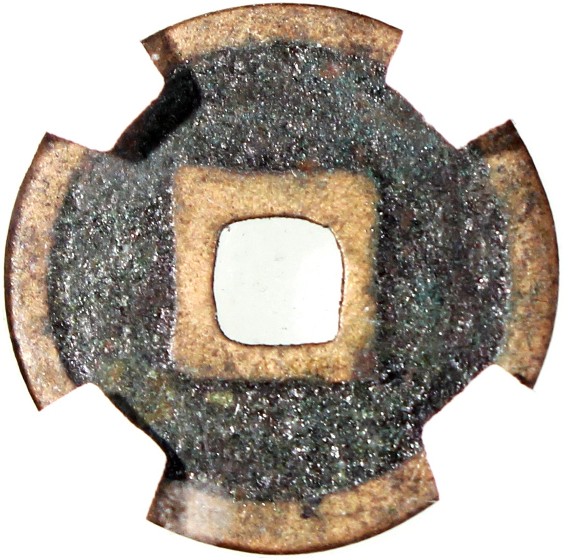 如魚似水素背方穿花錢,遼金(公元916–1234)時期,15.3*0.9mm,重1.1g,中乾80,標籤清朝。此錢素背,少。