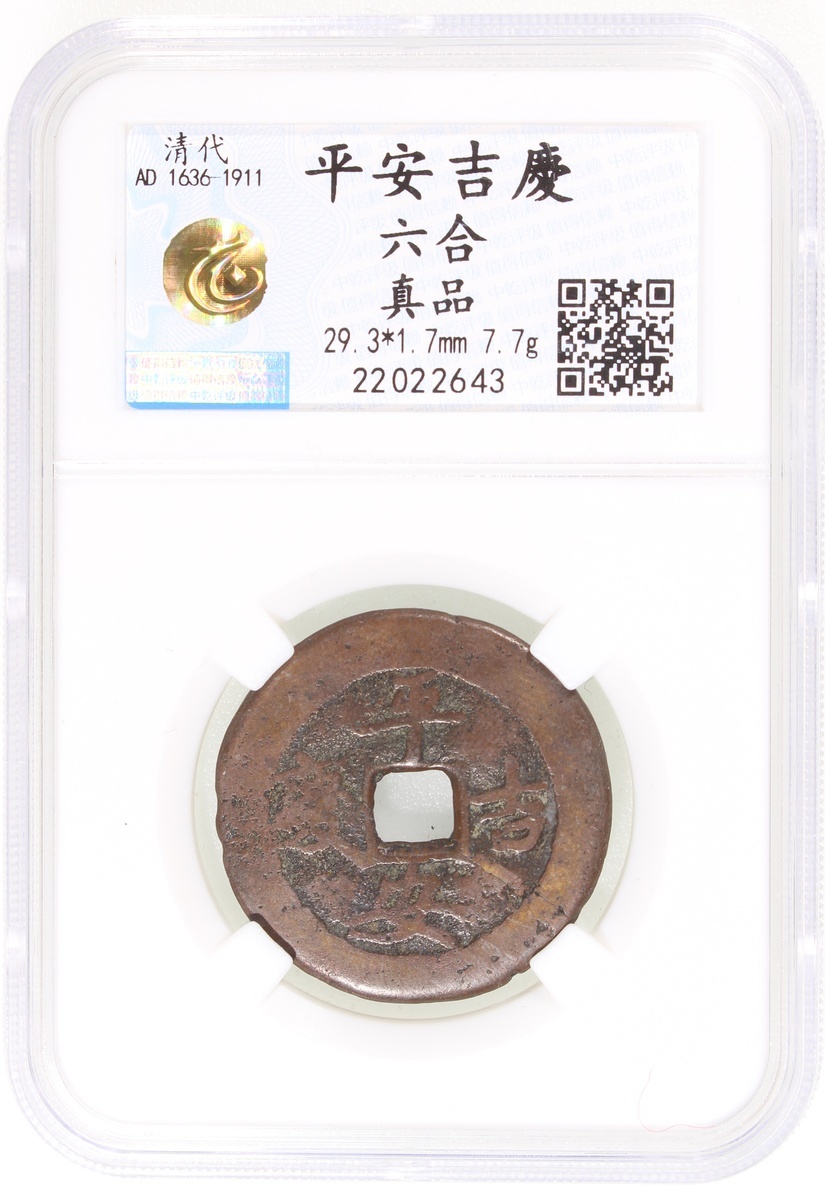 平安吉慶方穿花錢,背六合,清朝(公元1644–1911),29.3*1.7mm,重7.7g,中乾真品。
