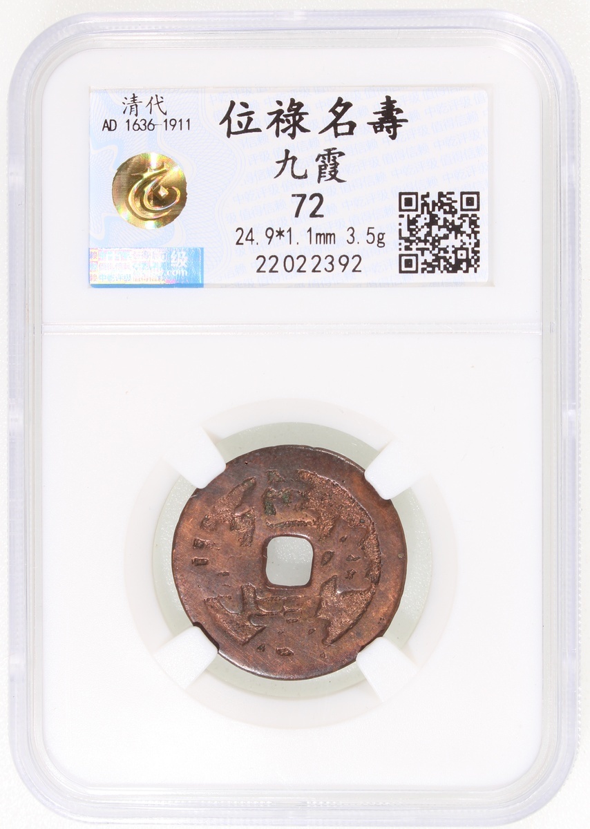 位祿名壽方穿花錢,背“九霞”,清朝(公元1644–1911),24.9*1.1mm,重3.5g,中乾72。少見品。