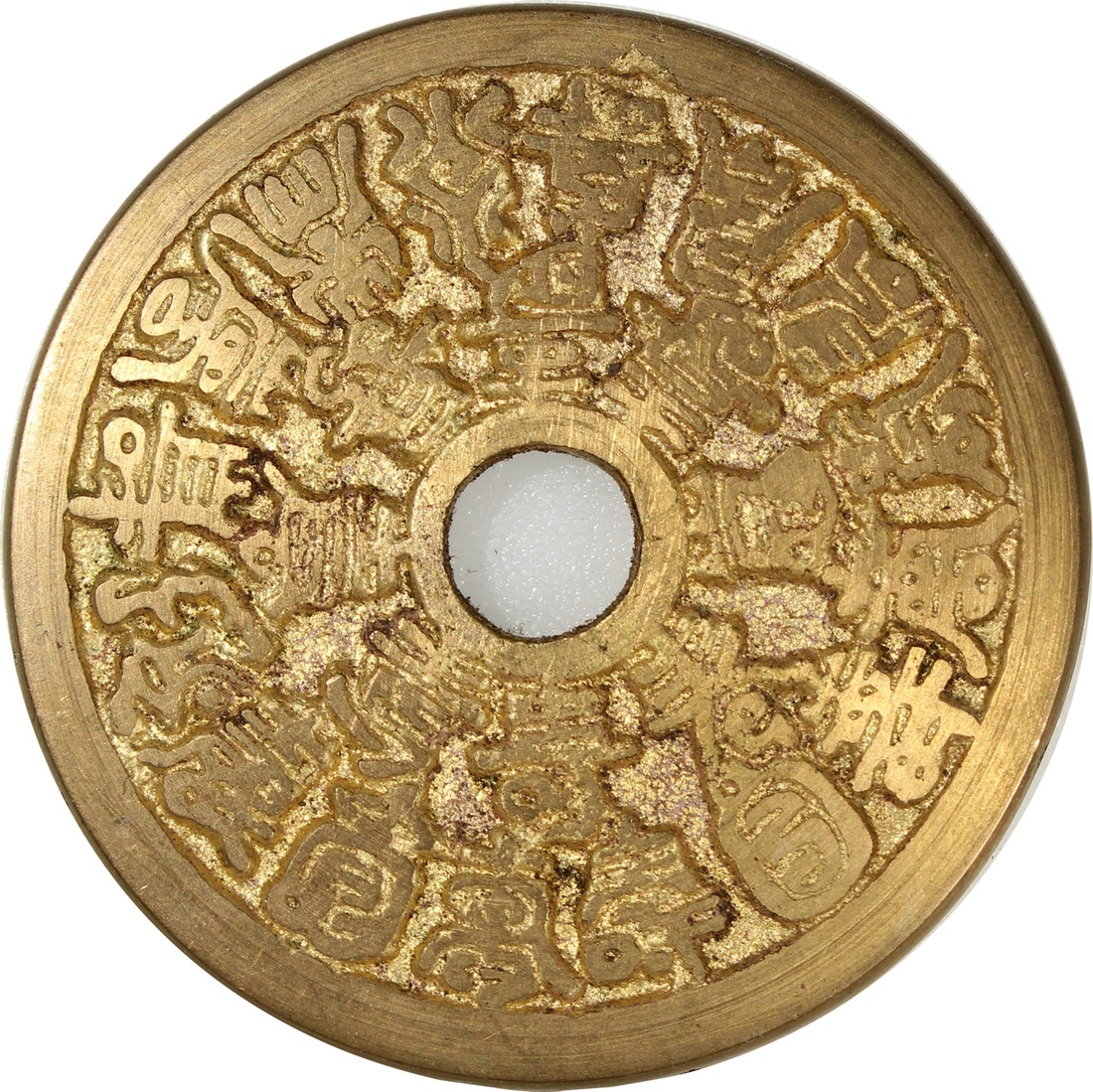 China: Republican Period (1911-1949), coin-shaped charm with round central hole, obverse inscribed 'Guan yin ci fu', reverse inscribed 24 characters of 'Shou' in seal scrpt, 45.3*3.5mm, 37.5g. Rare.