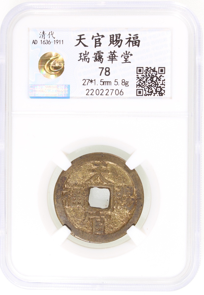 天官賜福方穿花錢,背瑞靄華堂,清朝(公元1644–1911),27*1.5mm,重5.8g,中乾78。少見。