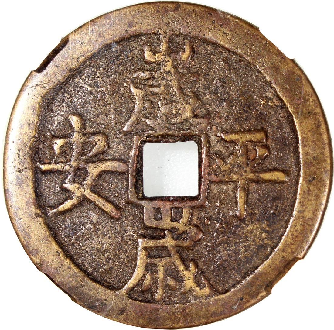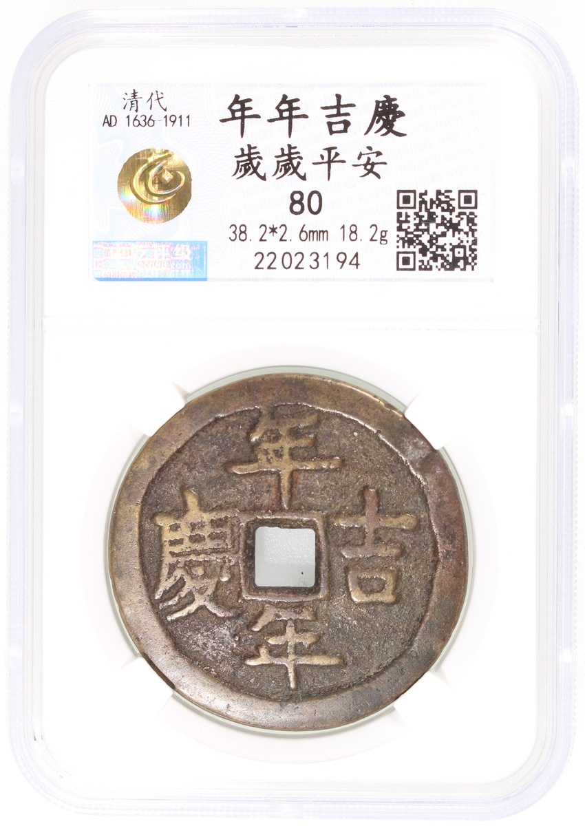 年年吉慶方穿花錢,背歲歲平安,清朝(公元1644–1911),38.2*2.6mm,重18.2g,中乾80。極美。