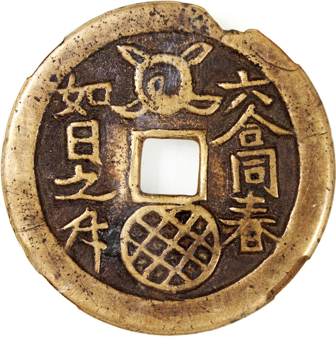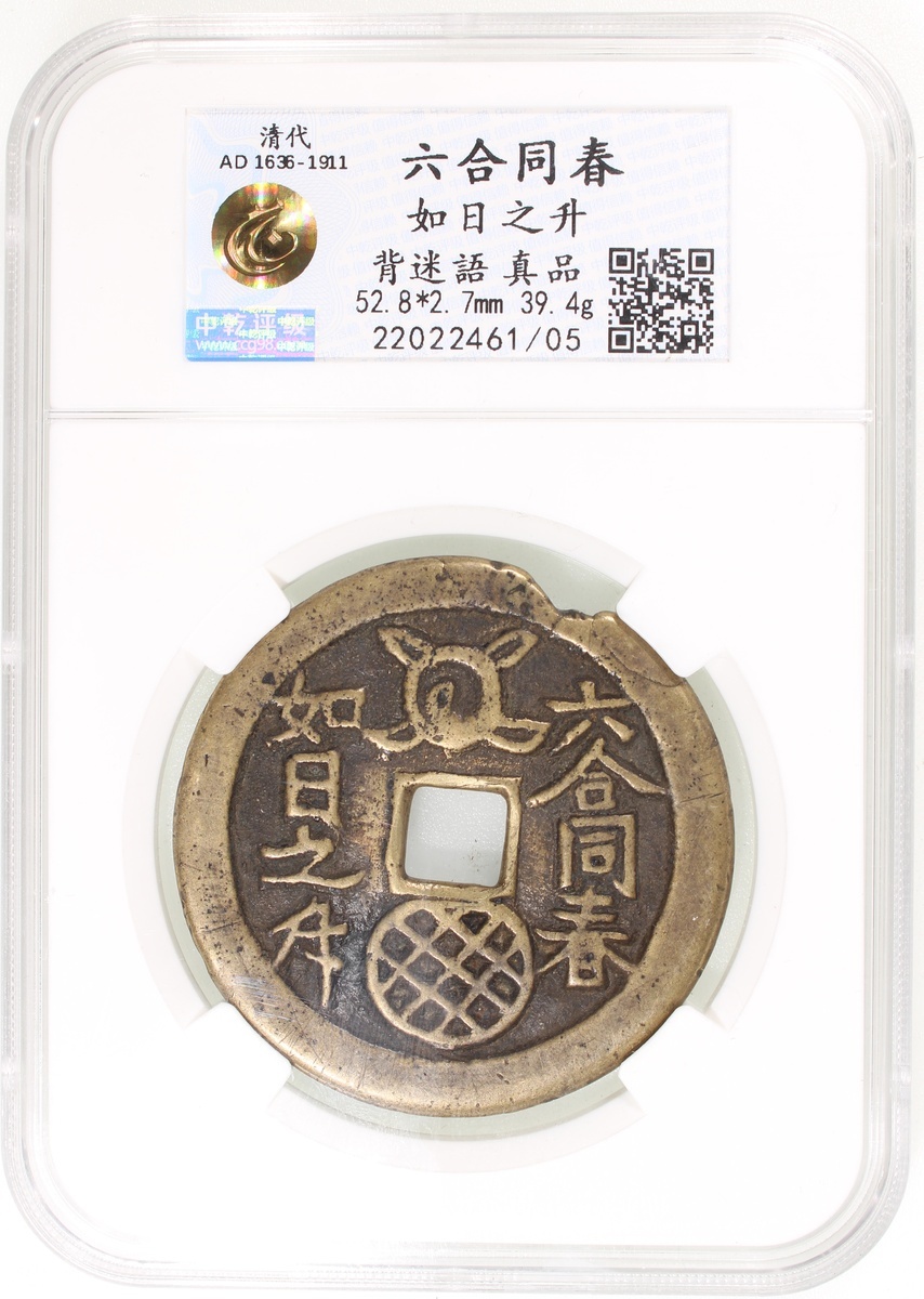 雲爐六合同春如日之昇方穿花錢,背謎語:“天下我為頭,無我不風流,倘若少了我,衣食也難求”,清朝(公元1644–1911),52.8*2.7mm,重39.4g,中乾真品。少見。