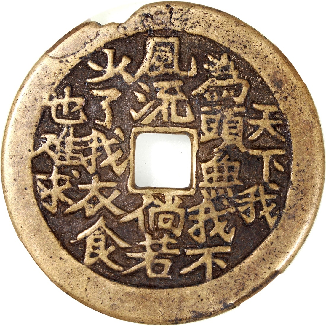 China: Qing Dynasty (1644-1911 CE), coin-shaped charm with square hole, Guizhou mint production, obverse inscribed 'Liu he tong chun ru ri zhi sheng', reverse inscribed a 20-character poem representing a riddle, 52.8*2.7mm, 39.4g, Zhong Qian Genuine. Scarce.