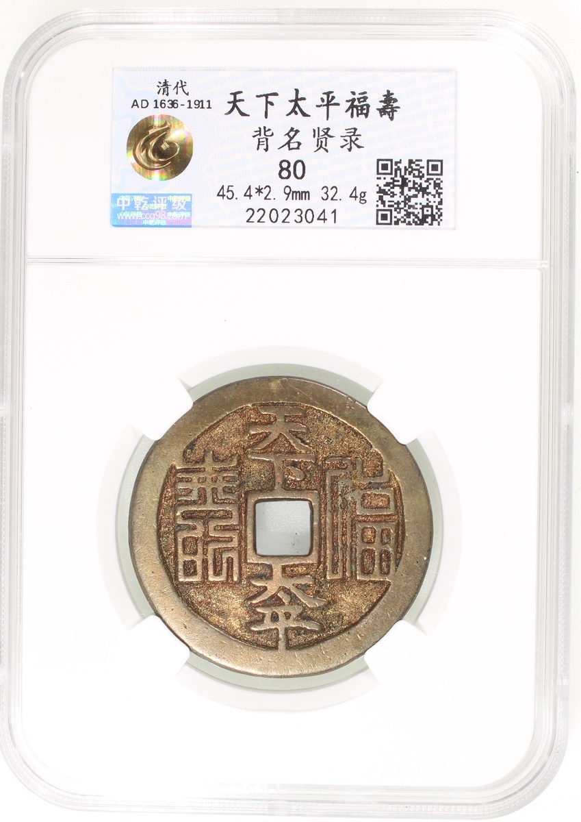China: Qing Dynasty (1644-1911 CE), coin-shaped charm with square central hole, obverse inscribed 'Tian xia tai ping' in regular script and 'Fu shou' in seal script, reverse inscribed a four-line poem, 45.4*2.9mm, 32.4g, Zhong Qian 80. Extremely fine, extremely rare.