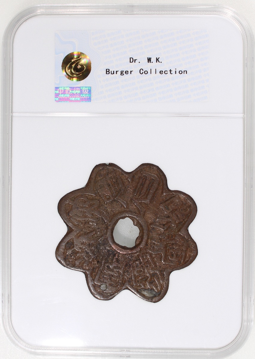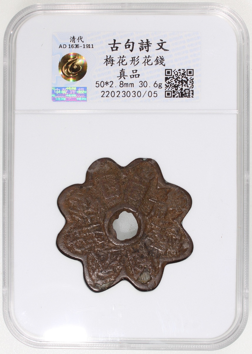 China: Qing Dynasty (1644-1911 CE), )flower-shaped charm with round central hole, Yunnan mint production, obverse and reverse inscribed two poetic lines circular in reading, 50*2.8mm, 30.6g, Zhong Qian Genunine. Rare. This piece is inscribed with eight characters on both the obverse and reverse. They combine into meaningingful readings when starting at any character in either forward or backward sequences.