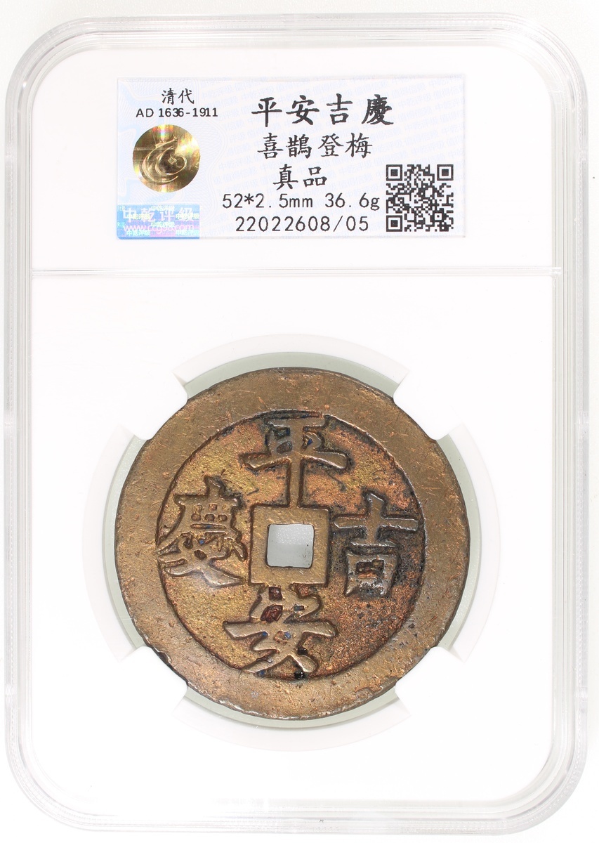 蘇爐平安吉慶方孔花錢,背喜鵲登梅,清朝(公元1644–1911),52*2.5mm,重36.6g,中乾真品。