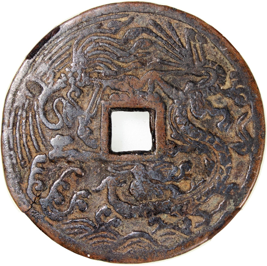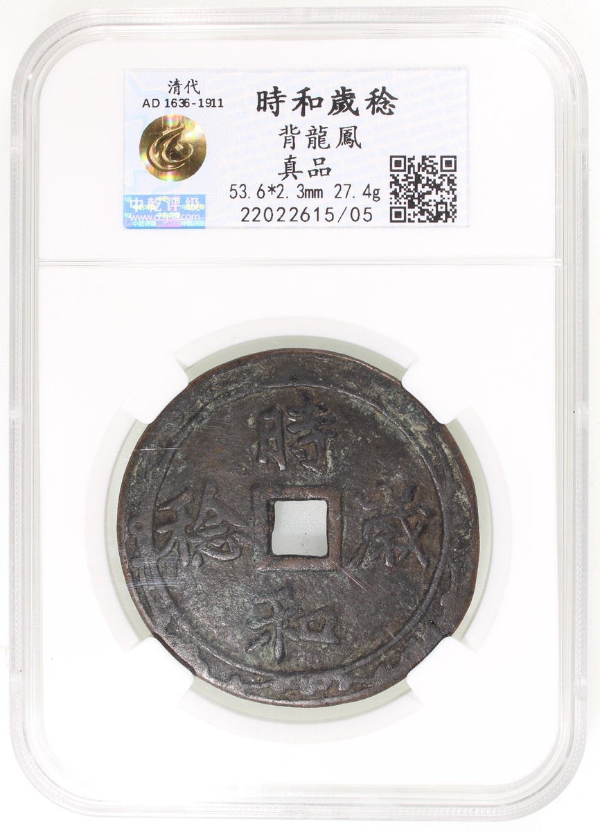 貴爐時和歲稔方孔花錢,背龍鳳,清朝(公元1644–1911),53.6*2.3mm,重27.4g,中乾真品。