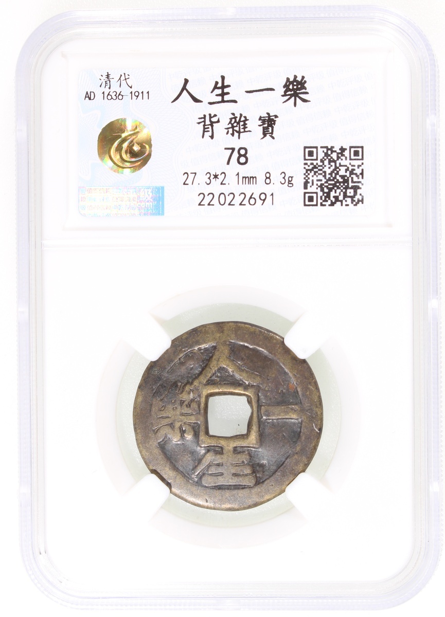 人生一樂方穿花錢,背雜寶,清朝(公元1644–1911),27.3*2.1mm,重8.3g,中乾78。少見。
