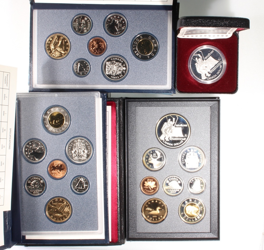 Canada, a trio of specimen coins set, 1997, one set contains 6x 92.5% silver coins, totally 76.2 g, the others nickel or bronze, togehter with a 25.175g proof silver dollar, 1997, '34 Seconds to Eternity...'