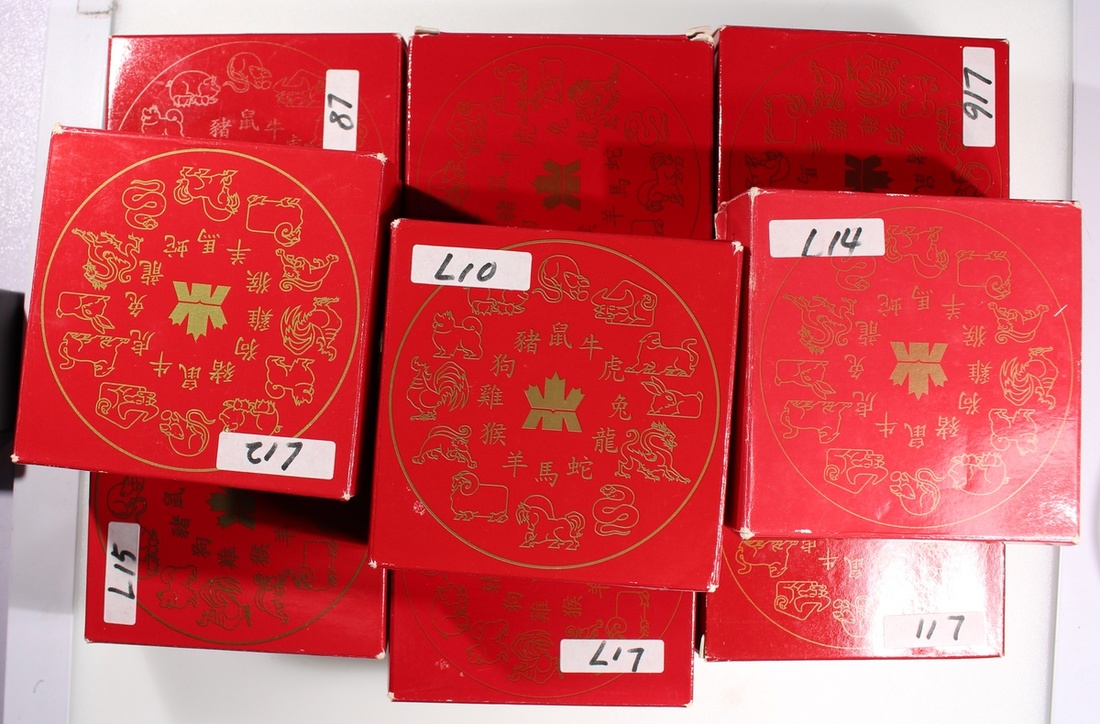 Canada, a lot of 9x silver proof $15, consisting of 2x 1998, 3x 2000, 2001-2004, Lunar series, Year of Tiger, Dragon, Snake, Horse, Goat and monkey respectively, 40mm in diameter, weigh 34g., contains 92.5% silver, 7.5% copper, Elizabeth II on obverse, the octagonal cameo at centre on reverse plated with 24-karat gold, with box and certificate, gem proof.