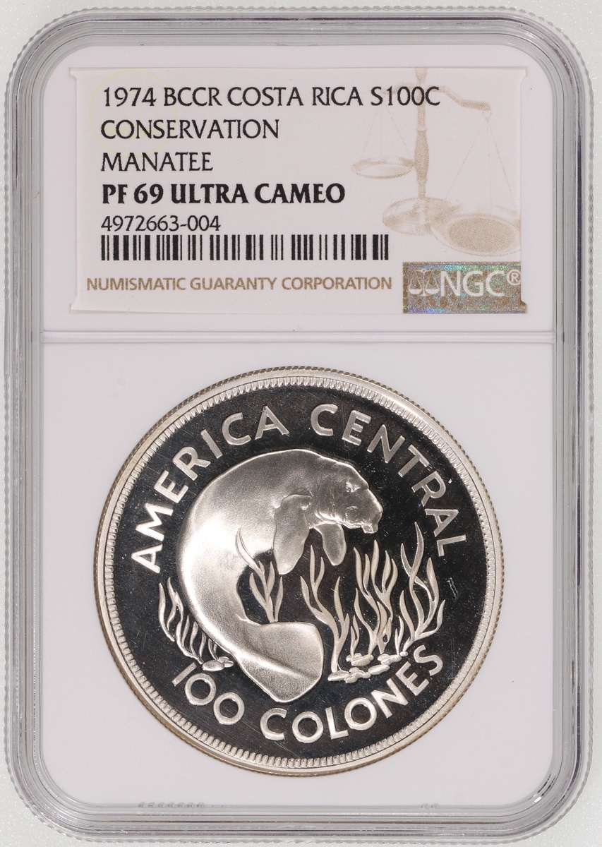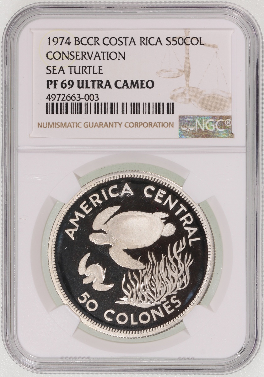 1974年哥斯達黎加保育主題50及100科朗銀幣一對,“海龜”及“海牛”,均NGC PF 69 Ultra Cameo,罕見高分,#497263-003 及 #497263-004
