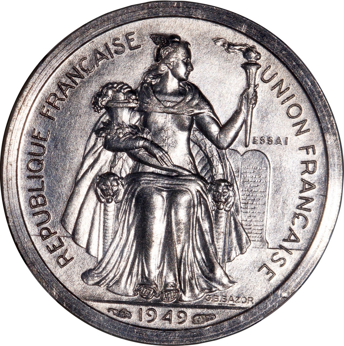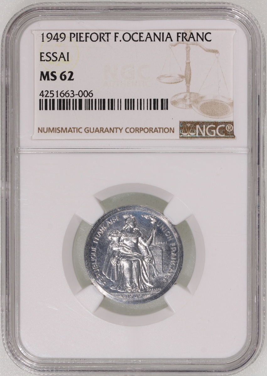 French Oceania, piefort 1 franc, 1949, ESSAI, NGC MS62, #4251663-006, limited mintage of 104 pieces .