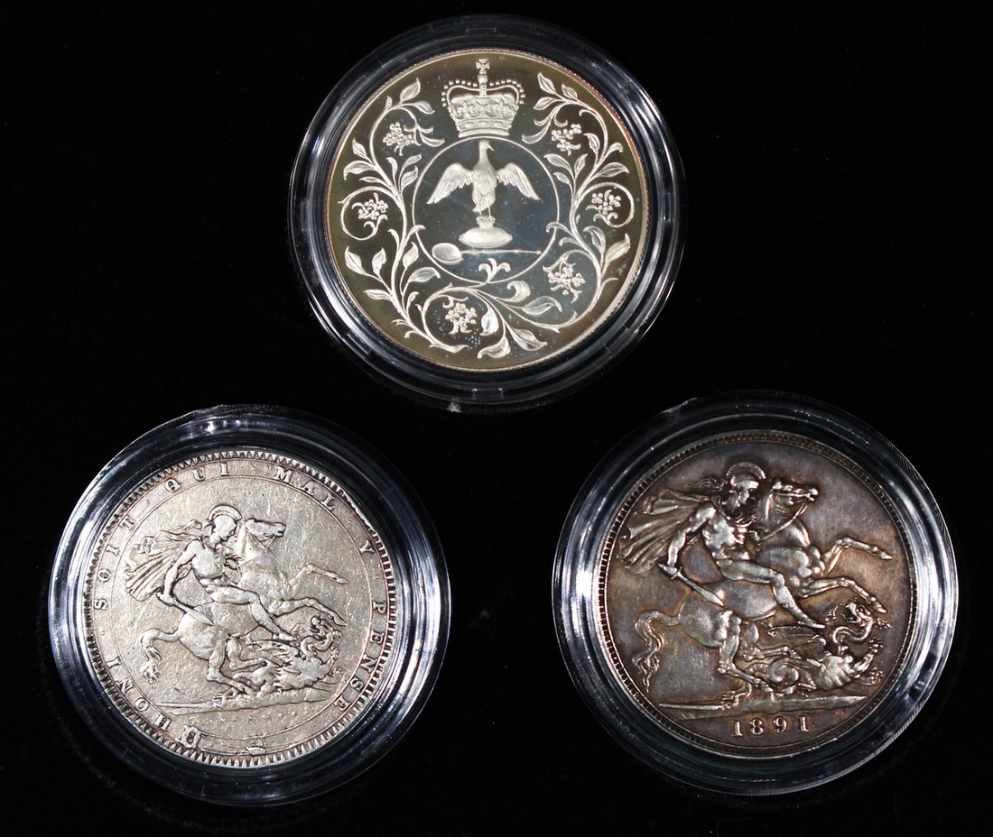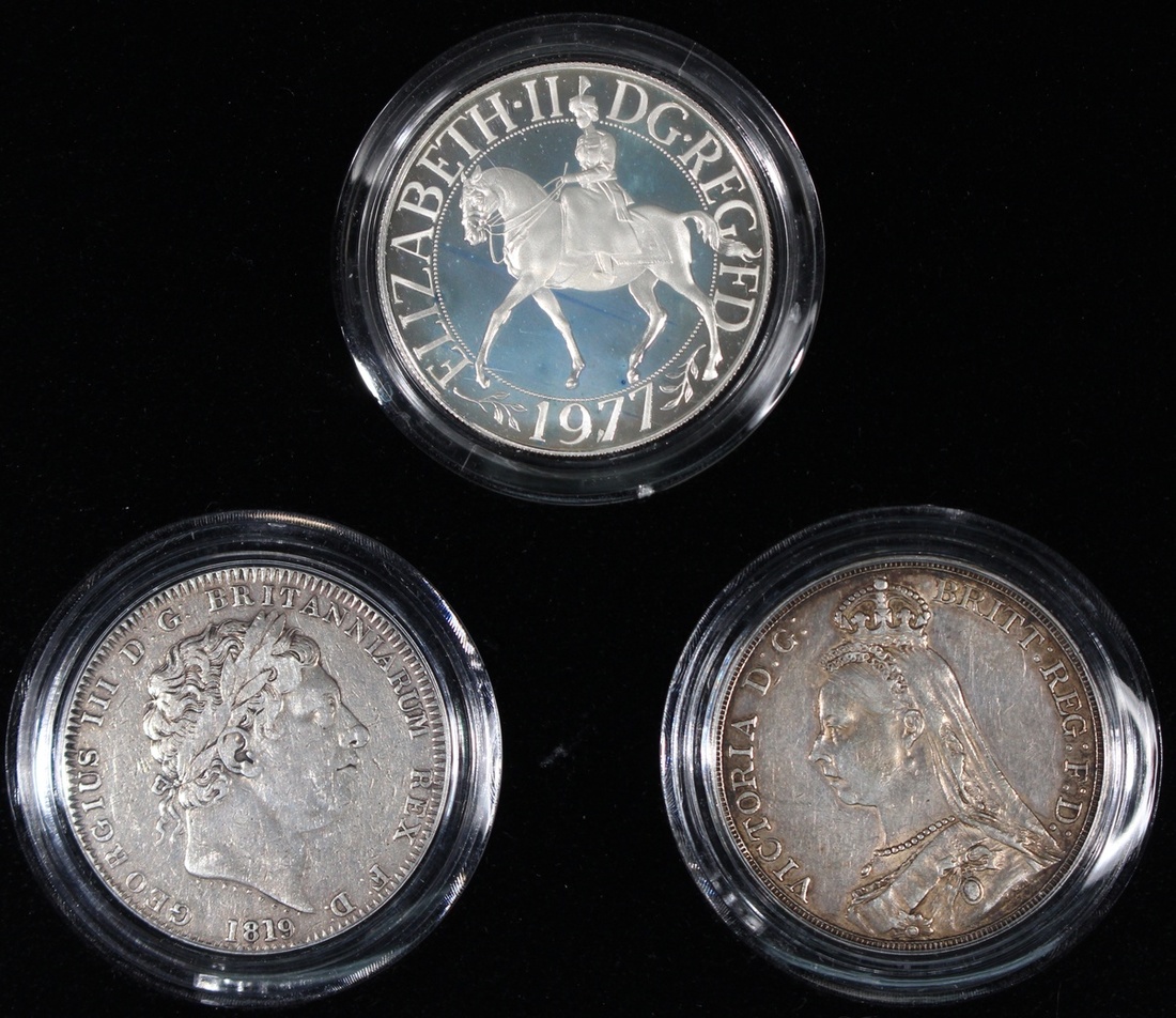 Great Britain, a set of 3, silver 5 shillings, 1819, silver 5 shillings, 1891, silver proof 25 pence, 1977, Longest Reigning Monarchs Silver Crown Set, George III, Queen Victoria and Queen Elizabeth II, ASW 80.6oz, with original packaging, box and certificate of issue, set number 44 of 200 (3)