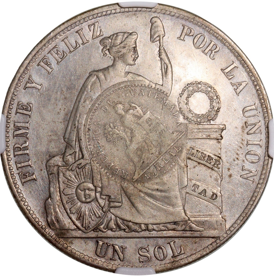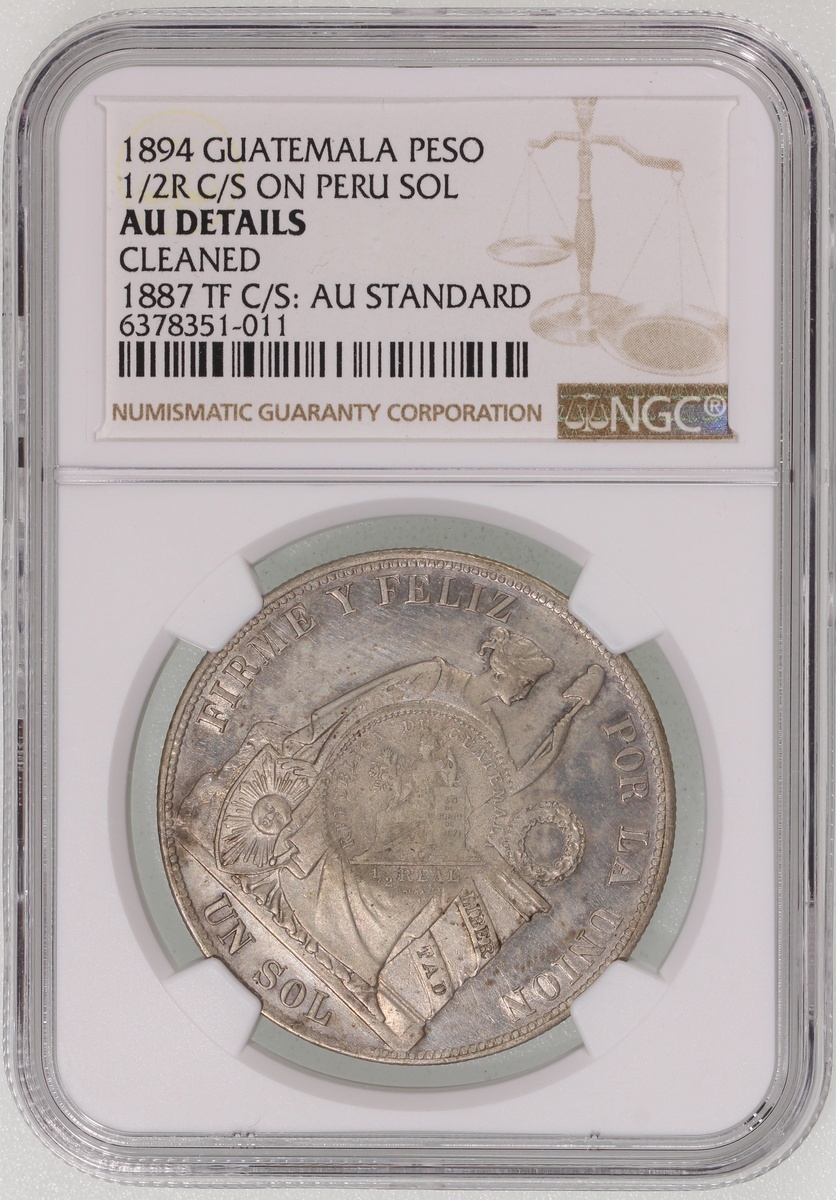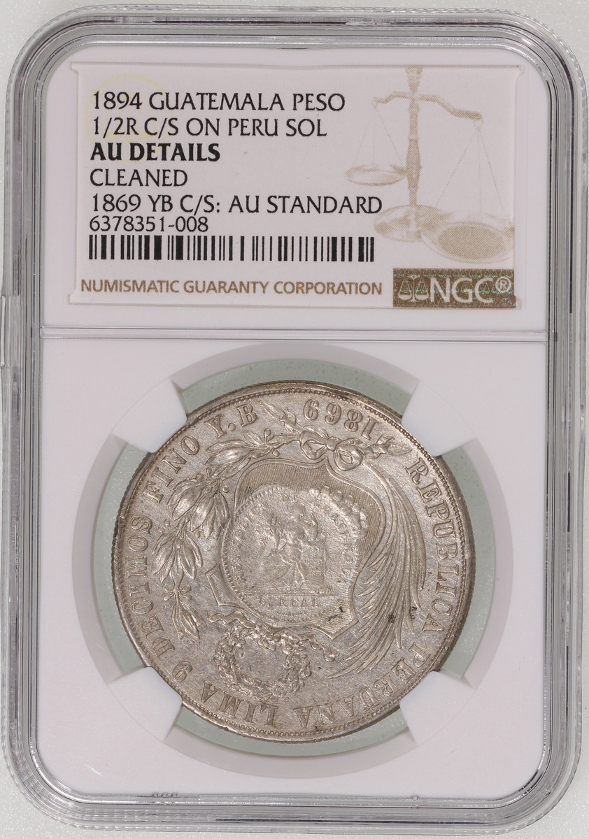 Guatemala, a pair of silver peso, 1894, 1869 and 1887 1/2 real counterstamped on peru sol, both graded NGC AU Details (Cleaned), #6378351-008 and -011 (2).