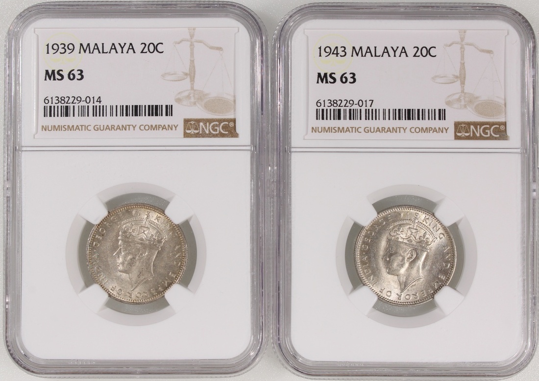 Malaysia, a pair of 20 cents, 1939 and 1943, both graded NGC MS63, #6138229-014 and #6134229-017 (2).