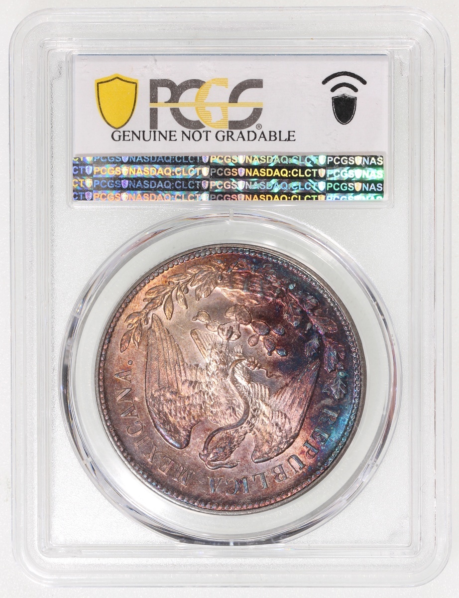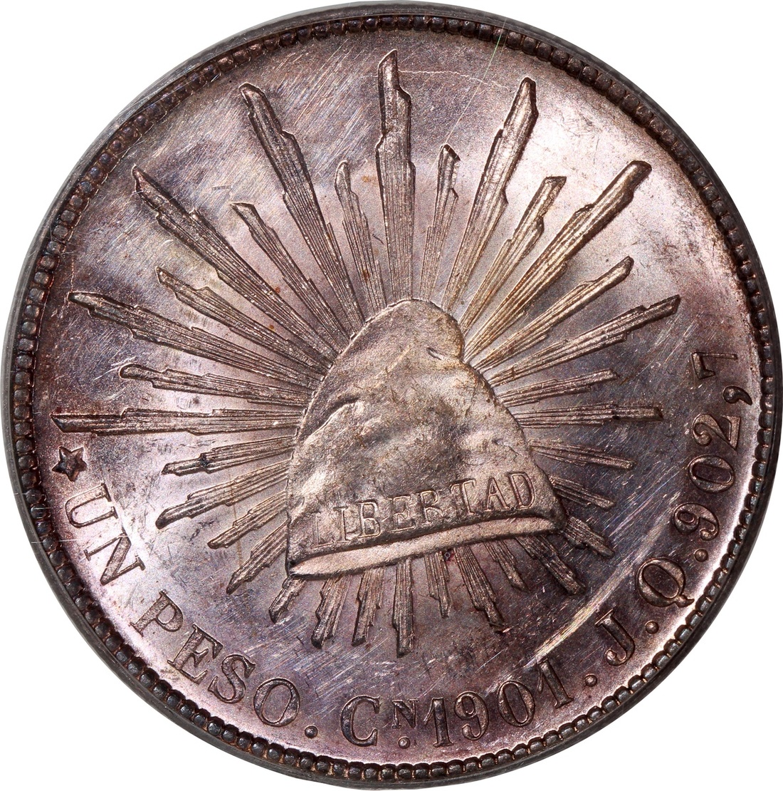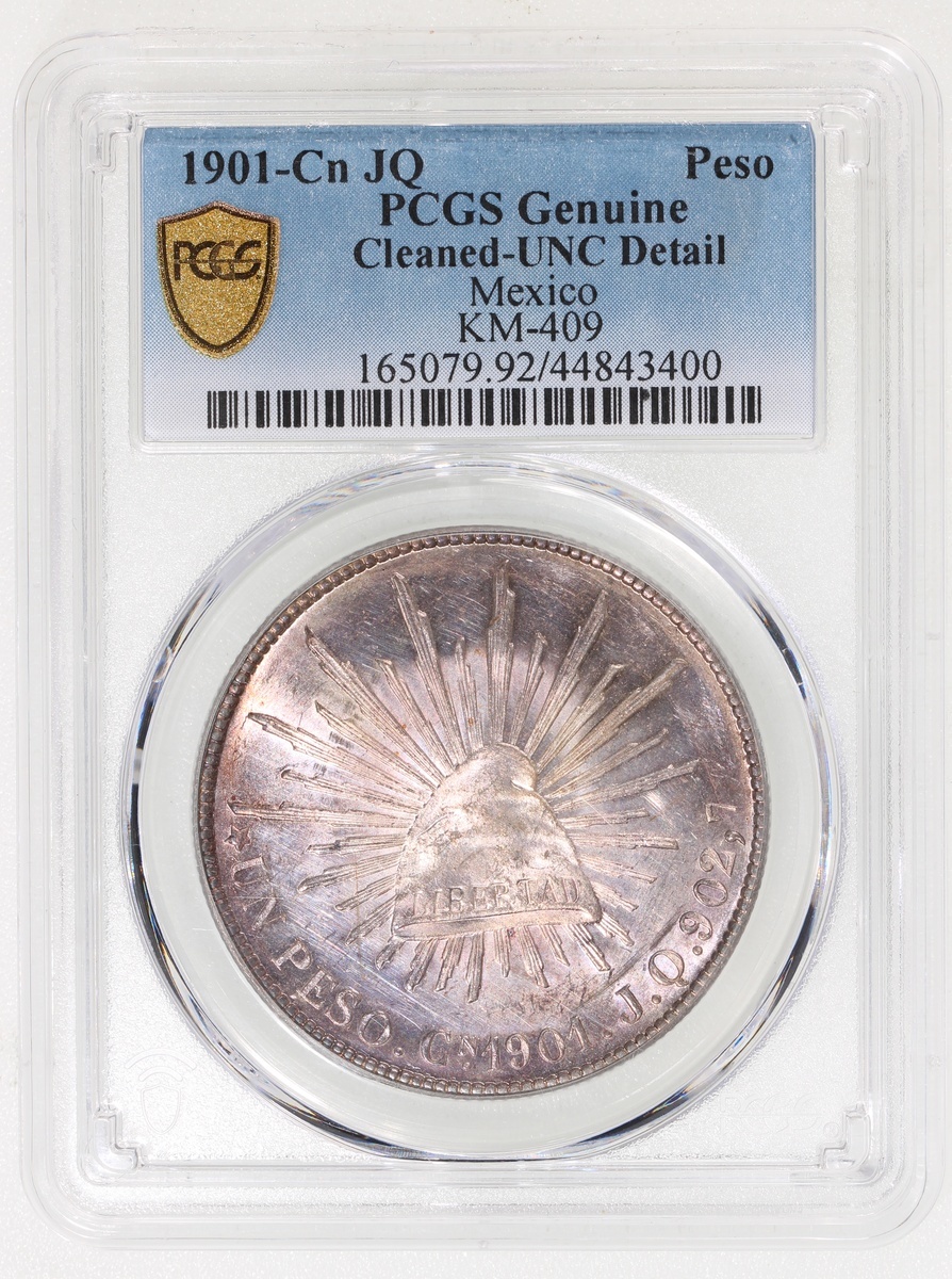 Mexico, 1 peso, 1901-Cn JQ, PCGS Genuine UNC Detail, cleaned. #44843400. Lovely toning throughout