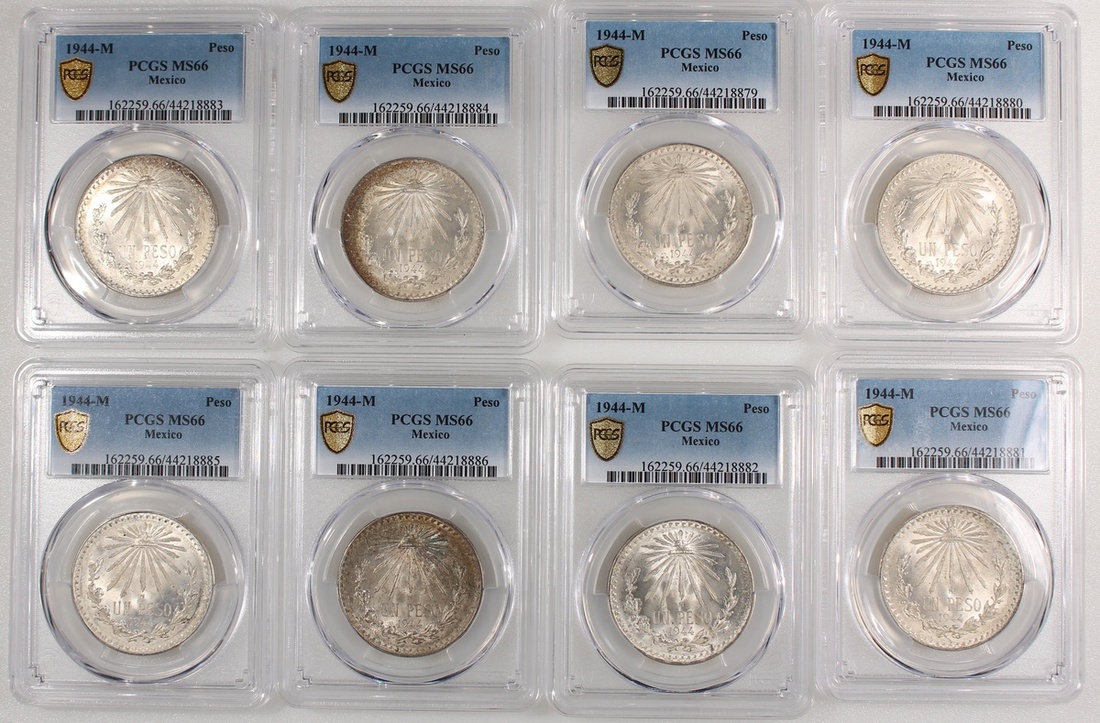 Mexico, a group of 8x silver peso, 1944-M, (KM-455), all graded PCGS MS66, #44218879 - #44218886 (8).