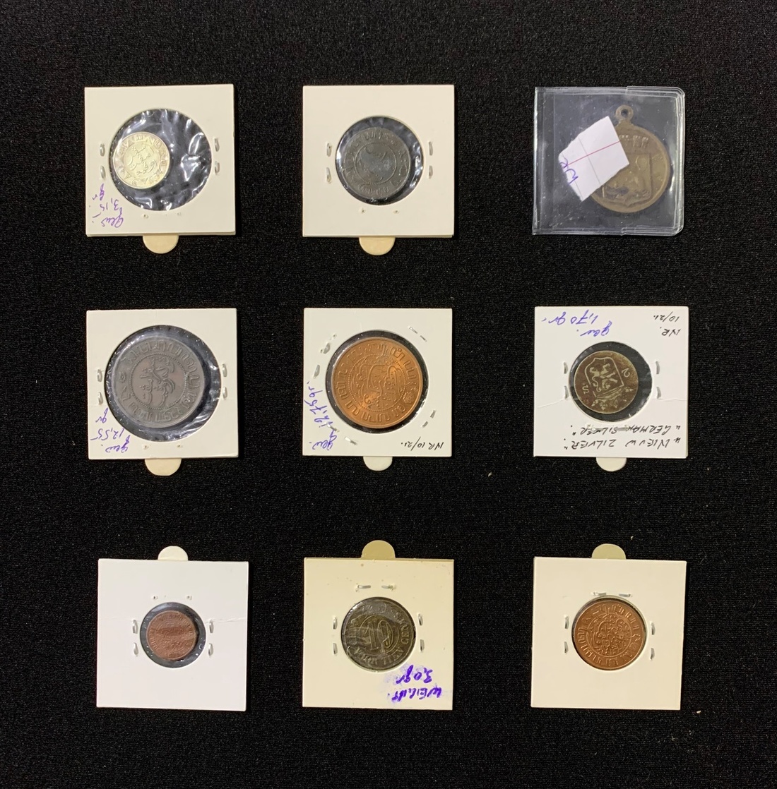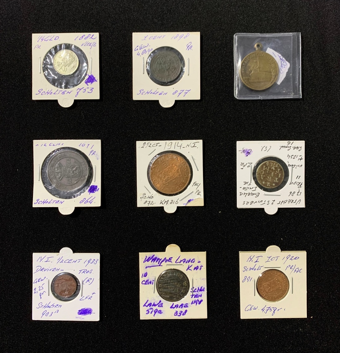 Netherlands, group of 9, 2 stuiver, Utretch, British imitation in German silver, 1786, weighs 1.70 grams, 8 Netherlands Indies coins, 1/2 cent, 1933, 1 cent, 1898, 1920, 2.5 cent, 1899, 1914, 1/4 gulden, 1882, also Plantation Token: Wampoe Langkat, 10 cents and a medallion,