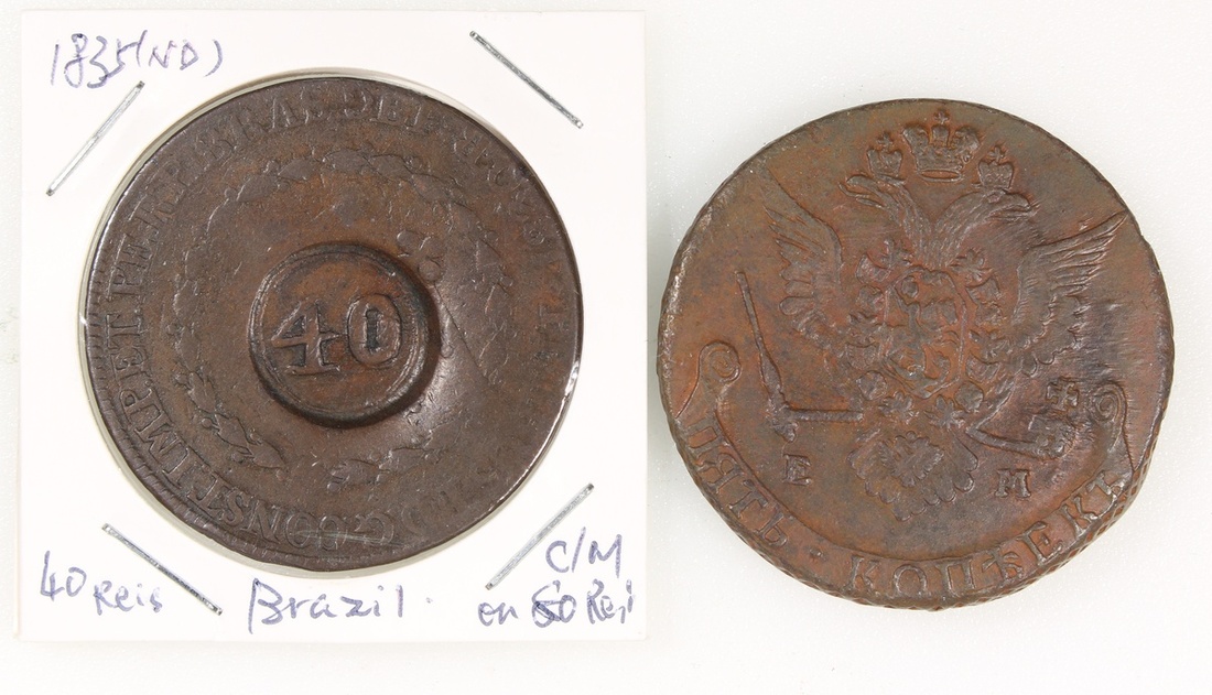Russia and Brazil, a pair of 5 kopecks, 1778, and 40 reis, ND(1835), well preserved, very fine or so (2).