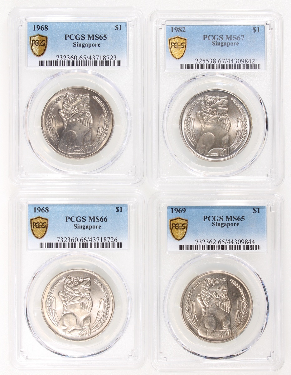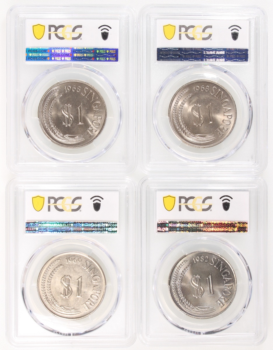 1968, 1969及1982年新加坡1元4枚,分別PCGS MS66, MS65, MS65 及 MS67