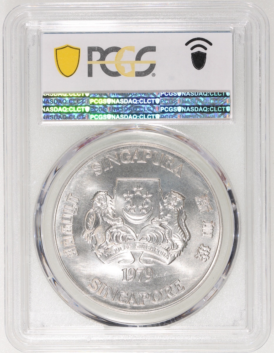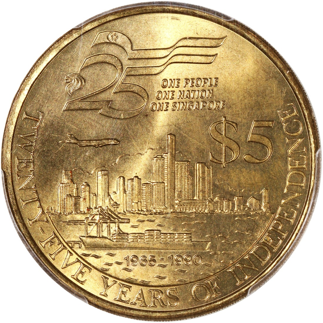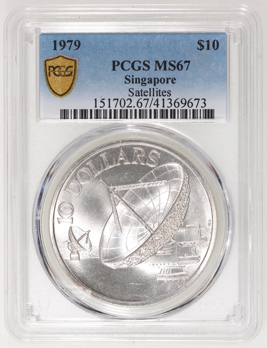 1990年新加坡獨立25週年紀念5元,及1979年衛星通訊紀念10元,均PCGS MS67