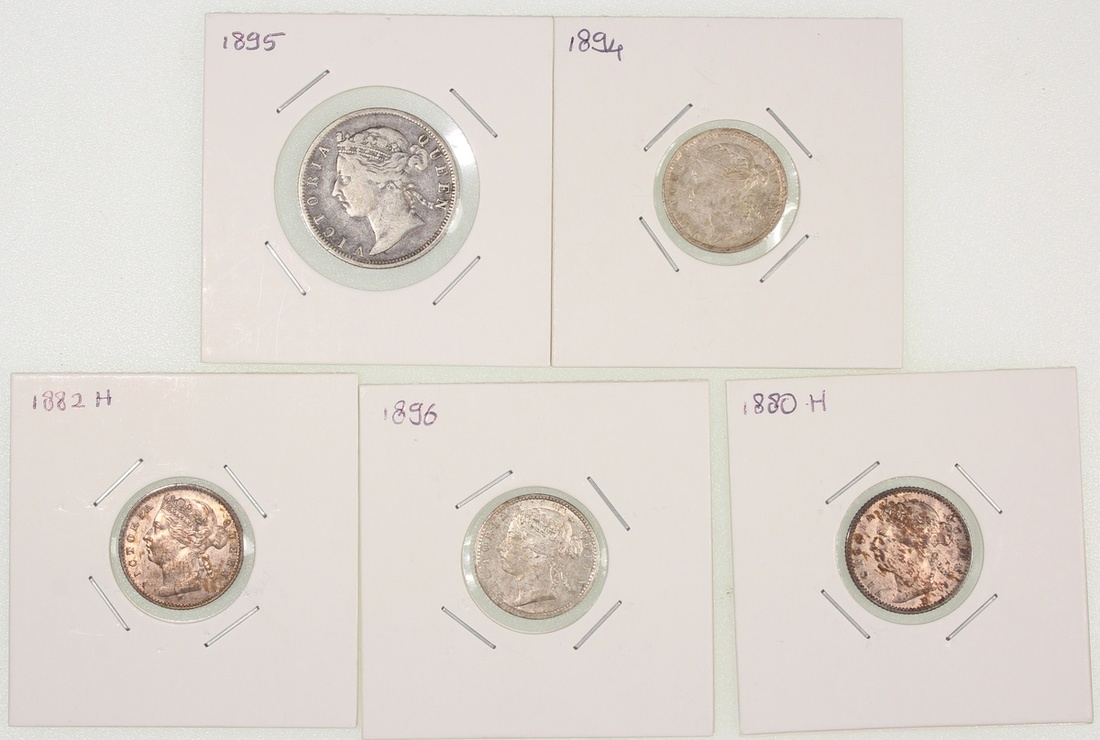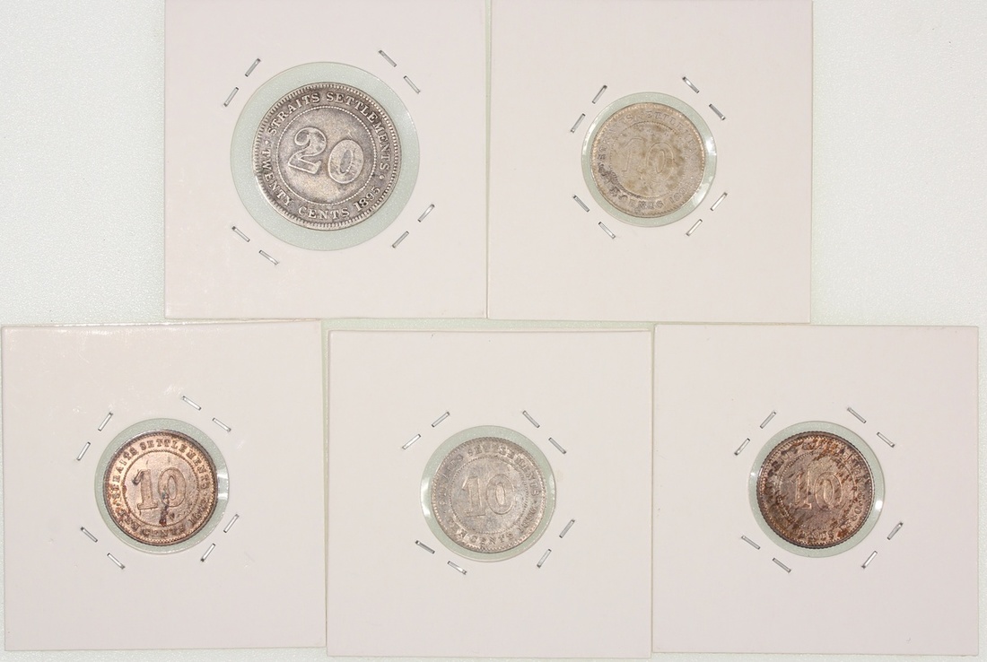 Straits Settlements, a group of 5x silver coins, consists of 4x 10 cents, 1880H, 1882H, 1894 and 1896, and 20 cents, 1895, very fine to about uncirculated (5).