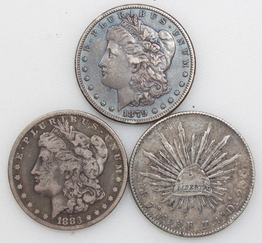a pair of silver $1, 1879 and 1883, eagle dollar, together with a Mexico silver 8R, 1893,