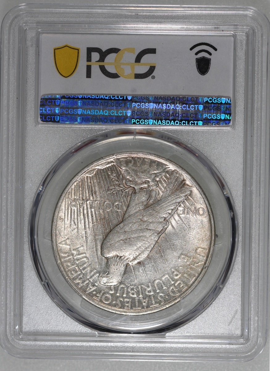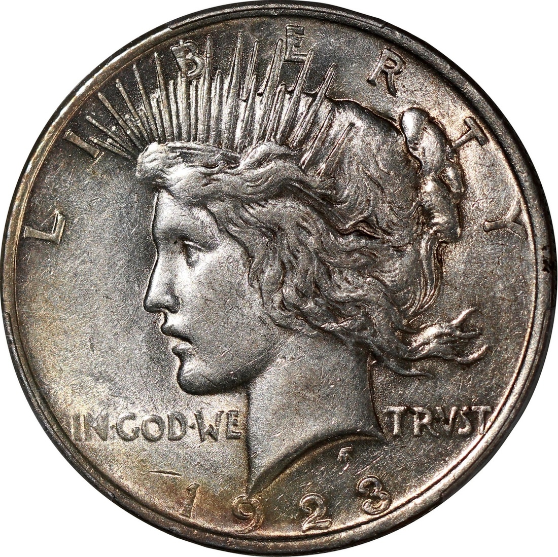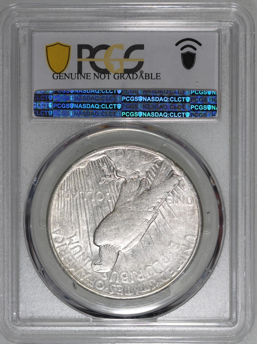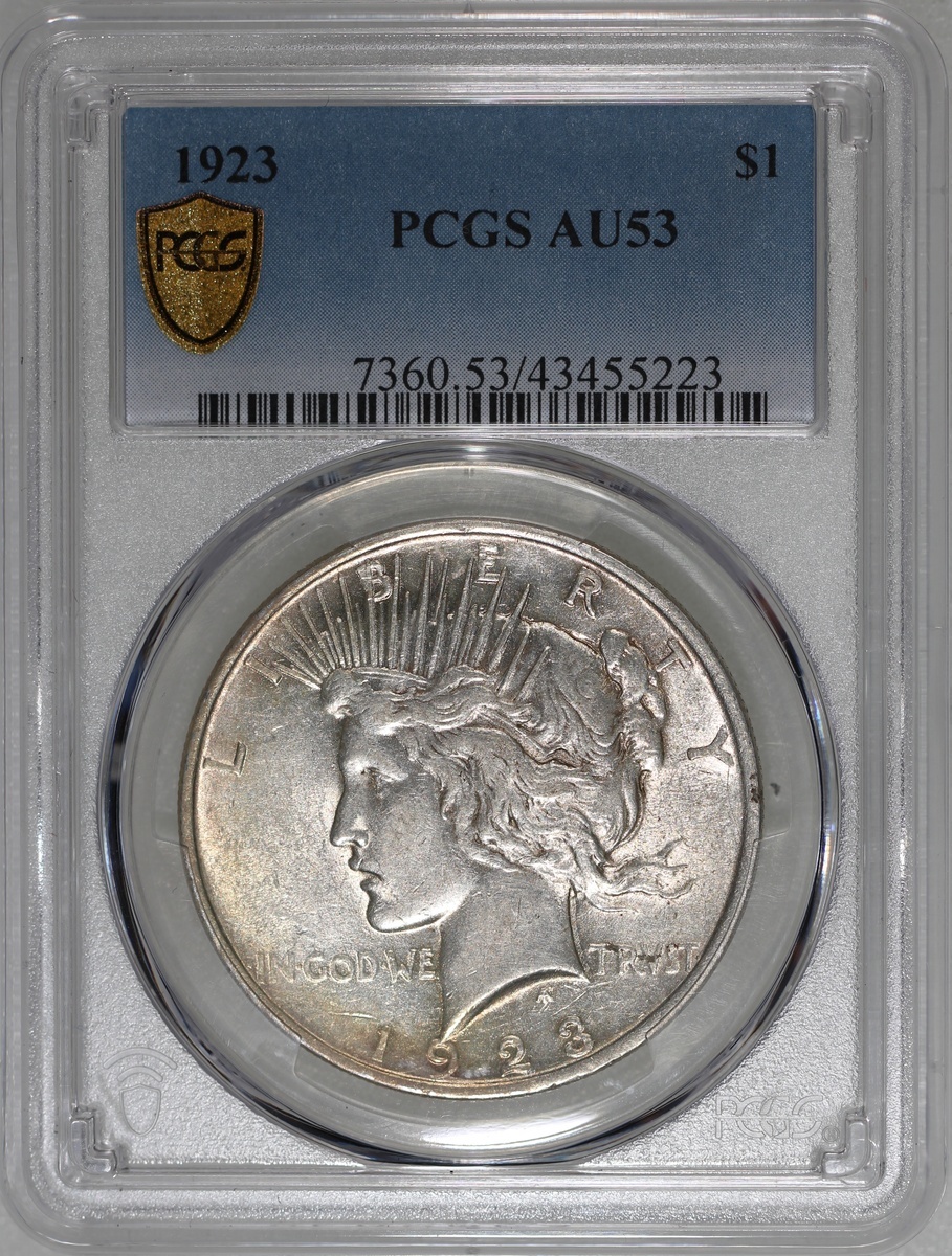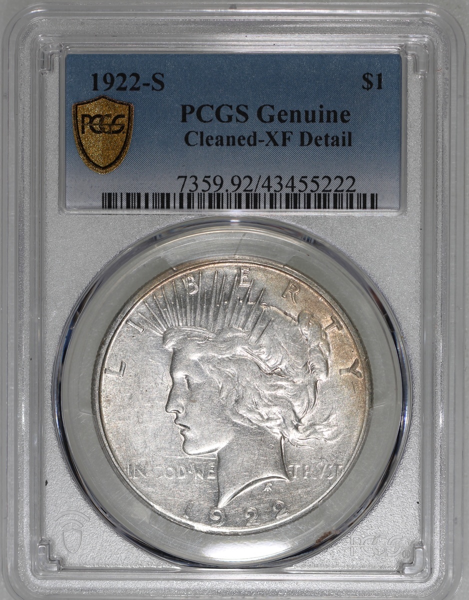 The United States, a pair of 'Peace' Dollars, 1922-S and 1923, graded PCGS Genuine Cleaned - XF Detail and AU 53 respectively, #43455222 and #43455223 (2).