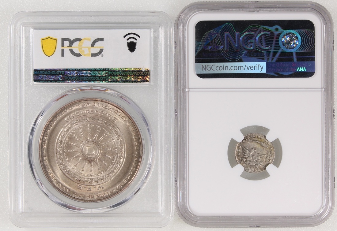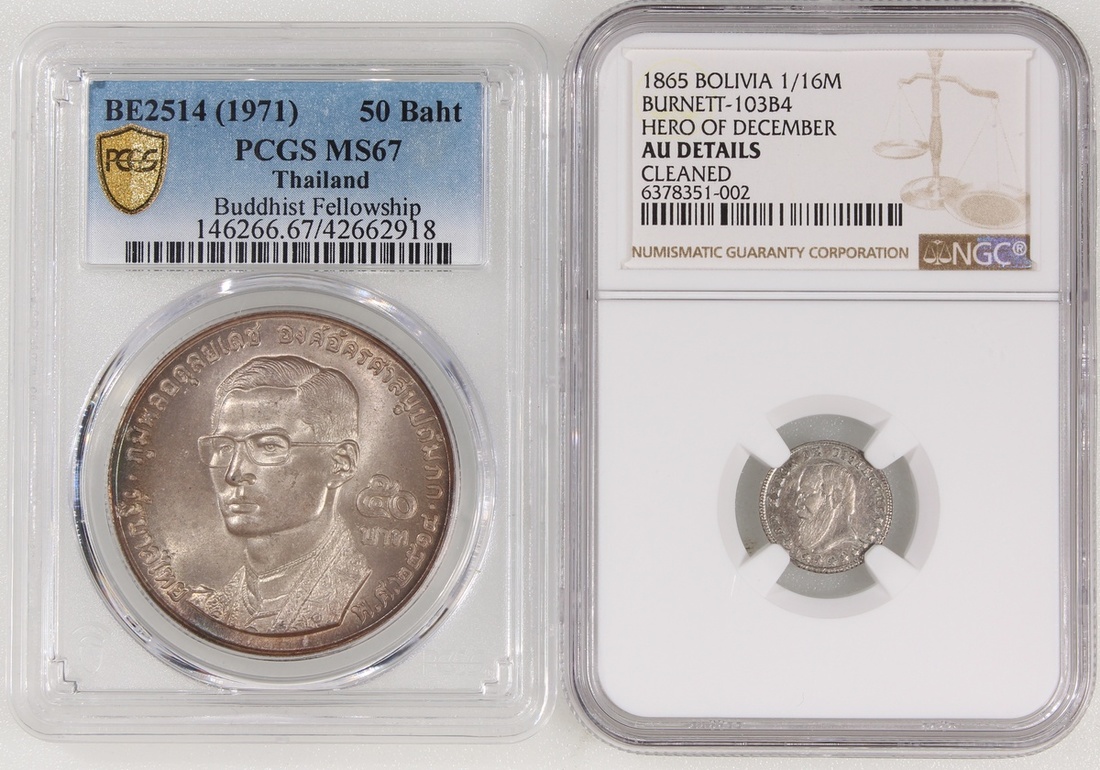 World Coins, a pair of commemorative coins, Thailand, 50 baht, 1971, The World Fellowship of Buddhists, and Bolivia, 1/16 melgarejo, 1865, Hero of December, graded PCGS MS67 and NGC AU Details (Cleaned), #42662918 and #6378351-002 (2).