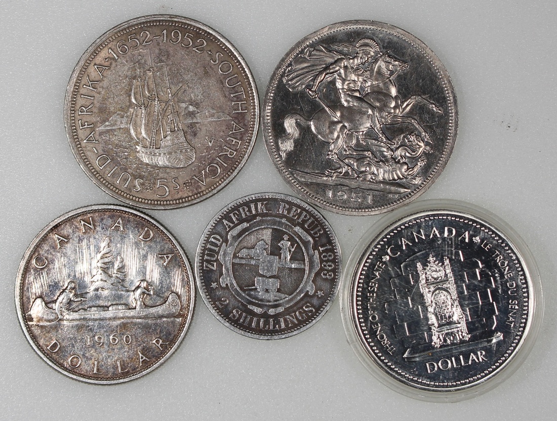 World Coins, a group of 5 silver coins, consists of: Canada, a pair of silver dollar, Elizabeth II on obverse, 1960 and 1977,the latter is commemorative issue of 25th Anniversary of the Coronation of Elizabeth II,
