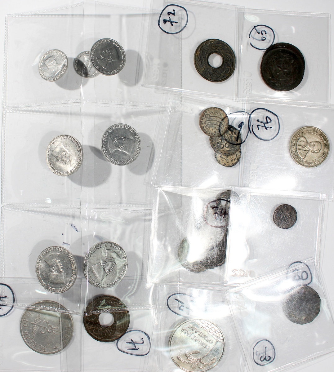 Asia, a group of 44, consisting of: Sultanate of Brunei, a pair of copper 1 cents, 1304AH (1887); Sultanate of Aceh, a trio of tin 1 keueh, ND (1844-1845); Sultanate of Kelantan, a pair of tin 1 pitis, 1897 and 1903; China, 'Chang Ji Yi Jiao' token; Islamic states of Malaysia, 9 pieces of miscellaneous tin coins; Singapore, a Meritorious Service Medal; Phillipine Culion Leper Colony, 1 peso and 10 centavos, 1920 and 1930; Netherlands Indies, 1/10 gulden-1943, 1/4 gulden-1921, 1/4 gulden-1941, 1 gulden-1914, ½ cent-1945, 1 cent-1945, 2½ cent-1945; Indonesia Irian Jaya, 1, 5, 10, 25, 50 sens, 1962; Indonesia Riau Archipelago, 25, 50 sens, 1962; India, Madras Presidency copper 2½ cash, ND (1807); Indonesia, one set of 1970's uncirculated coins (1 rupiah-1970, 2 rupiah-1970, 5 rupiah-1970, 5 rupiah-1974, 10 rupiah-1971, 10 rupiah-1974, 25 rupiah-1971, 50 rupiah-1971 and 100 rupiah-1973); mixed condition (44) [65, 69, 71-80, 126]
