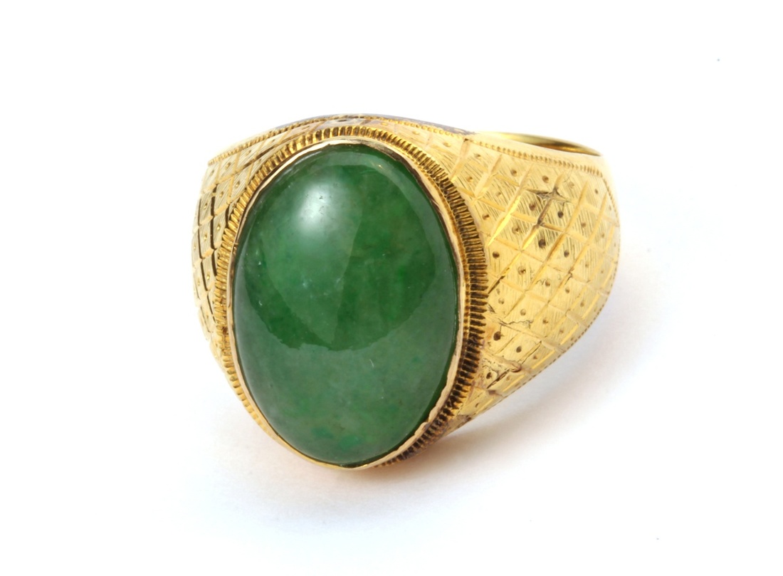 Karat gold ring inlaid with green jade, with diamond-shaped line engraving on both sides of the ring. Weight: jade and gold 0.192tl in total