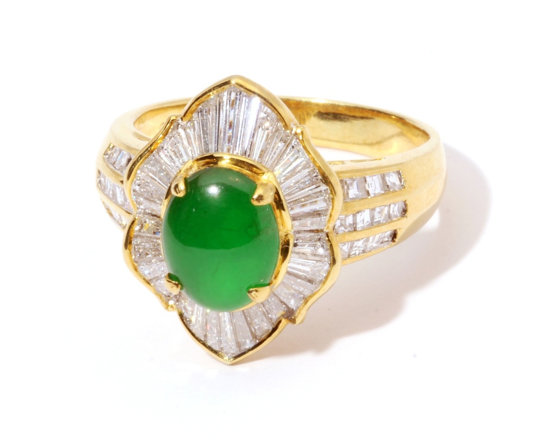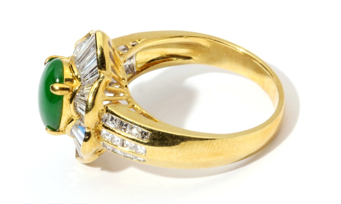 鑲翡翠及鑽石18K金戒指, 造型精巧. 戒指內側上刻有"750" 字樣. 重量: 共0.187tl