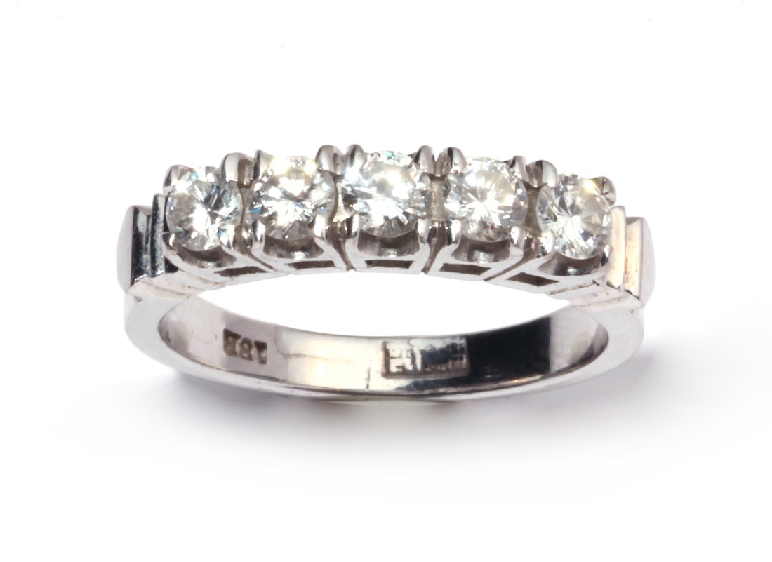 18K白金戒指, 頂部鑲有鑽石五粒. 精緻得體. 戒指內側上刻有"18K" 字樣. 重量: 共0.072tl