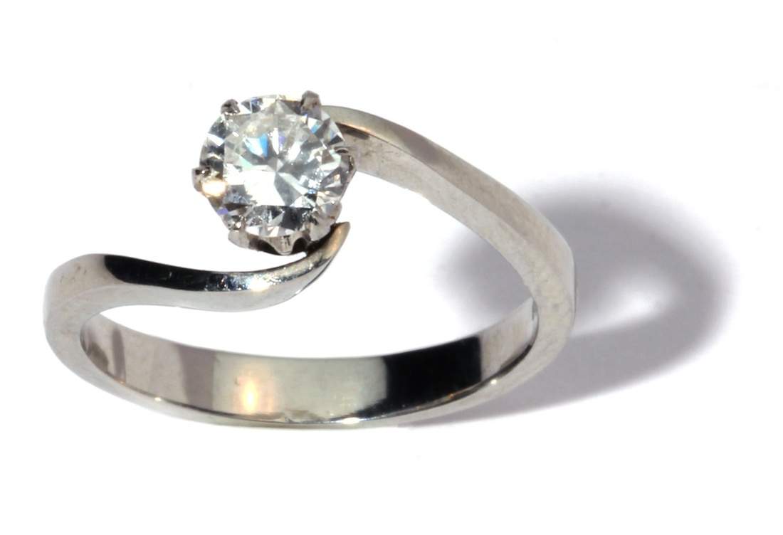 18K白金戒指, 頂部鑲有鑽石一粒, 戒指頂部呈扭形線條設計, 造型獨特. 戒指內側上刻有"K18" 字樣. 重量: 共0.100tl