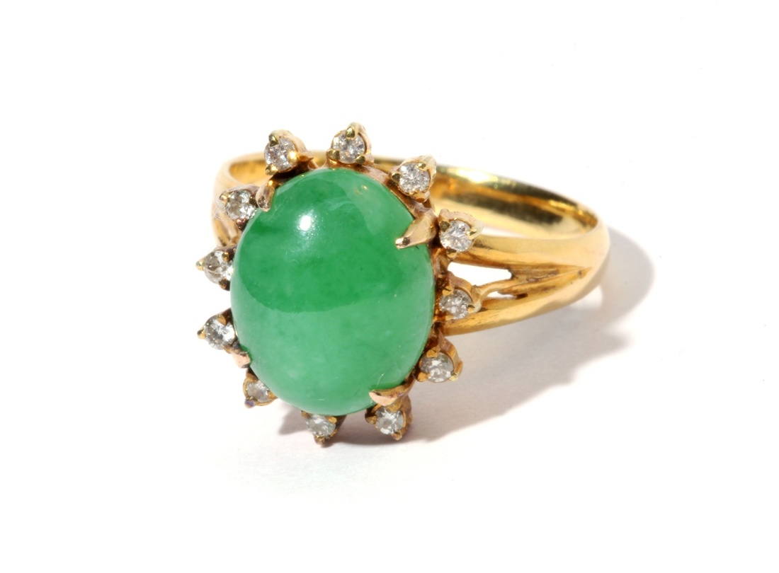 14K金戒指, 戒指頂部鑲嵌翡翠一粒, 再襯托十二顆小鑽石於翡翠的周邊, 成拱托之㔟. 重量: 共0.096tl